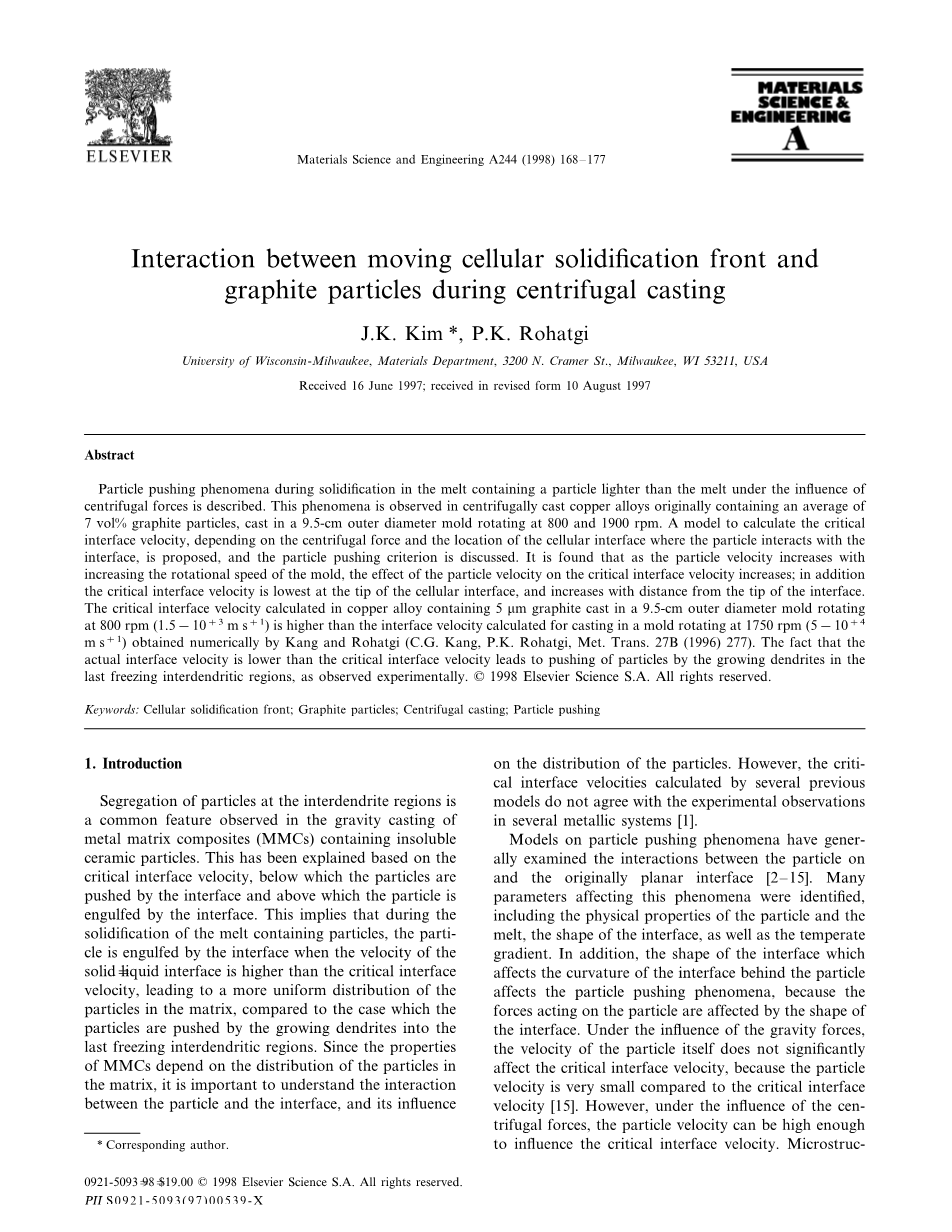 粒子推现象模型一般都检查了颗粒与最初平界面之间的相互作用[2–15],影响这一现象的许多参数都被确定了,包括该颗粒的物理性能和熔体的界面的形状,以及温带梯度,此外,影响粒子后面界面的曲率的界面形状影响粒子推现象,因为作用在粒子上的力受到界面的形状的影响。根据重力的影响下,粒子本身的速度不显著影响关键接口速度,因为它相比于临界界面的粒子的速度是非常小的速度[15]。然而,离心力的影响下,颗粒速度就足以影响临界界面速度。含有分散的石墨颗粒的铜合金的离心铸造的显微观察显示的石墨颗粒的偏析在枝晶间区域可能是由于颗粒被生长的固体或液体界面推动,这表明界面速度小于临界界面速度。肯尼迪和克莱恩[16]提示到,在恒定的离心力,以高冷却速率得到高的接口速度,会导致颗粒被接口吞噬。他们观察到,在铝13-mm的氧化铝粒子的离心力的影响下融化是通过以2毫米每秒的临界界面速度被接口吞噬的,离心力作用下,粒子的速度大于重力铸造过程中的速度,因此,同重力铸造的条件下离心铸造相比,对颗粒和接口之间的相互作用的颗粒速度的效果要重要得多。