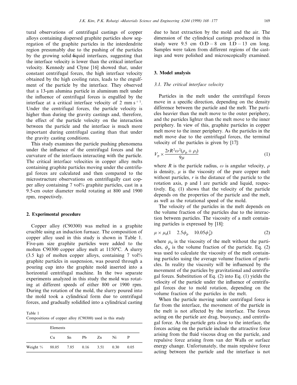 在离心力作用下,这比重力作用下高得多的粒子速度,可以影响颗粒和界面之间的相互作用,在含有分散颗粒熔体离心铸造中,粒子和接口之间的交互依赖于相对粒子运动的方向凝固方向。分散在铜熔体中的石墨颗粒在离心力作用下移动到内周,他们的移动方向是相同的接口的移动方向。因此,在铜合金含有石墨颗粒在离心力作用下的临界界面速度可以被表示为[19]: