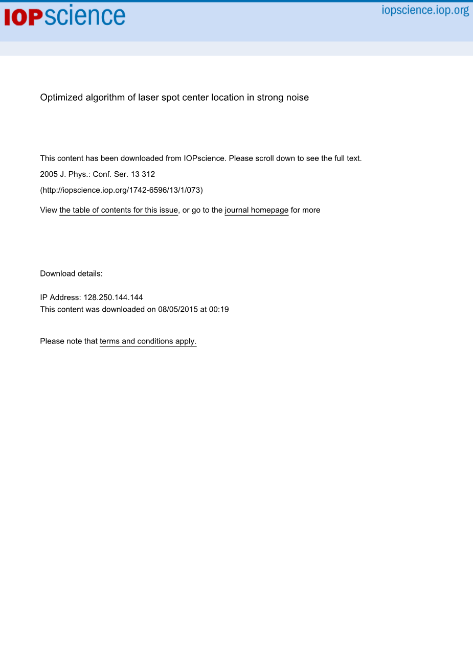 一些实验来证明所提出的算法。计算机是Pċ133MMX,操作系统是Windows XP,和编程软件VC 6.0。实验中所用的激光光斑图像显示在图3中,本文提出的算法在图4中所示的图像,并在表1(使用方法)显示中心位置的结果。强噪声背景下激光光斑中心位置的不确定度小于0.05像素。