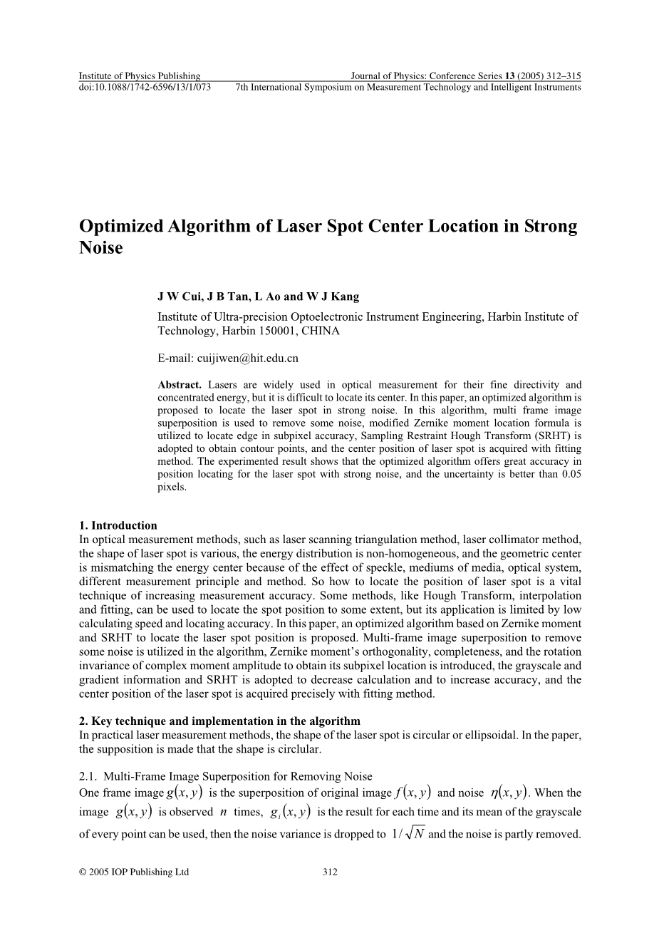 摘要:由于良好的方向性和能量的集中性,激光在光学测量中得到广泛应用。在本文中,提出了一种强噪声下的激光光斑中心定位的优化算法。在该算法中,多帧图像叠加用于去除某些噪声,改进的Zernike矩 位置公式被用来在亚像素精度定位边,采用采样约束霍夫变换(SRHT)获得的轮廓点,以及通过拟合的方法获得激光光斑的中心位置。实验结果表明,优化后的算法在强噪声环境下定位精度高,且不确定度好于0.05像素。