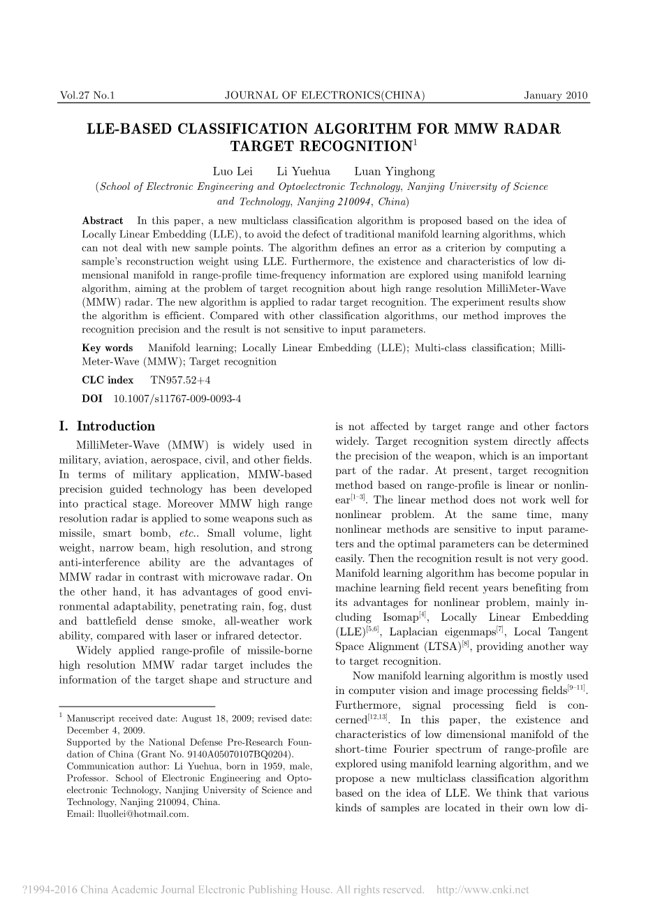 关键词 流形学习;局部线性嵌入(LLE);多层次分类;毫米波(MMW);目标识别