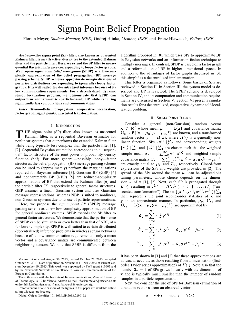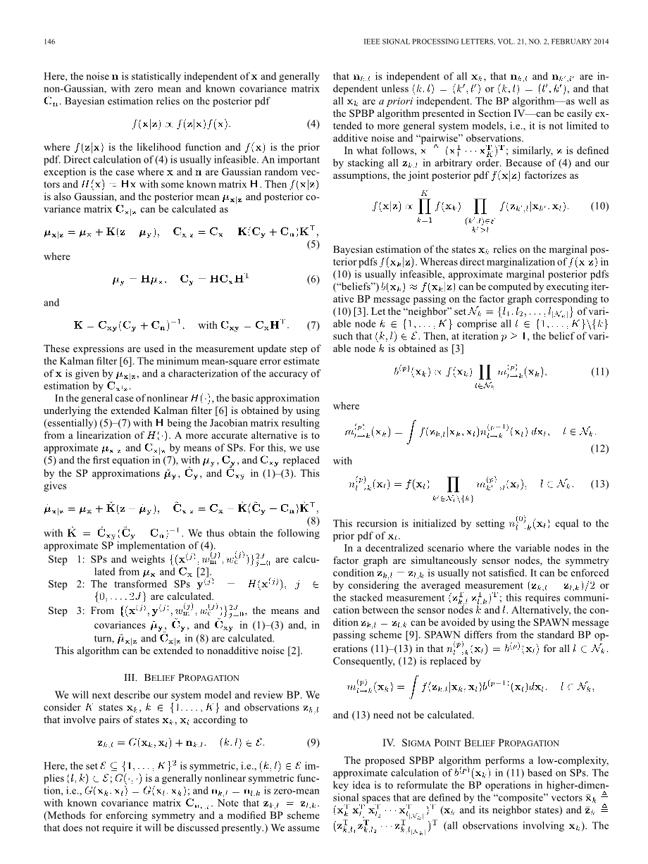 我们所提出的SPBP算法是BP消息传播方案的一种低复杂度的逼近。SPBP算法将SP滤波器(也称无迹卡尔曼滤波器)扩展到对于一般的(循环)因子图的贝叶斯估计中。用通过SPs和无迹变换计算的均值向量和协方差矩阵表示消息和边缘后验概率。因此,SPBP算法同时避免了高斯BP的线性假设和非参数BP(基于粒子的)高复杂度。由于通信要求低,SPBP特别适合于无线传感器网络中的某些分散的推理问题。特别的,我们对一个离散协作动态的传感器自定位场景进行了仿真,其结果显示,在性能、复杂度和通信要求层面上,SPBP算法都明显优于NBP