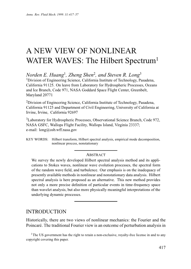 希尔伯特的观点是基于一种新的方法,称为经验模态分解(EMD)和希尔伯特谱分析,被希尔伯特(1996)和希尔伯特等人(1996,1998a)这样描述。它已被发现许多直接应用在各种各样覆盖地球物理(希尔伯特等1996,1998a)和生物医学工程(希尔伯特等 1998b)的问题上。在这篇评论中,将总结出一个新方法,流体力学的例子,非线性水波与湍流的数据将被用来说明这种方法来解释这些现象在动力学中的应用。