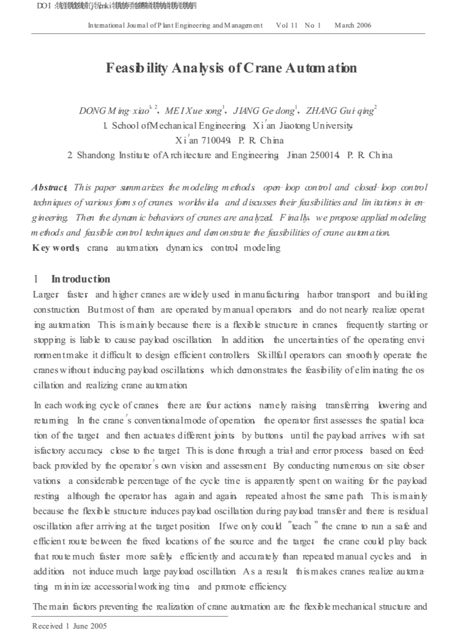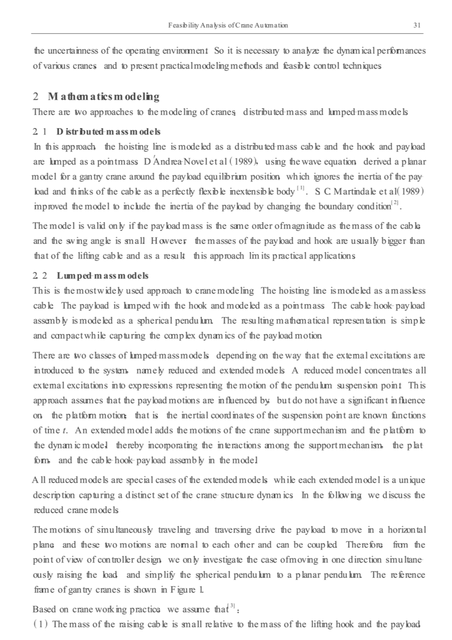 本文总结了起重机的建模方法、开环控制以及闭环控制等各种形式的起重机技术,并在世界范围内讨论了工程的可行性和局限性。对起重机的动态行为进行了分析。最后,我们提出应用建模方法和可行的控制技术来证明起重机自动化的可行性。