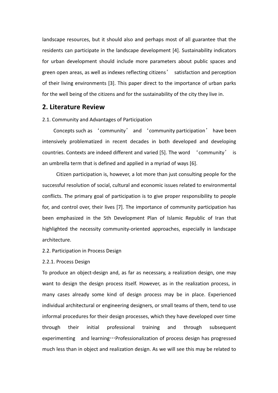 有的城市的户外空间特殊环境的重要性,体现在各类少污染和小气候条件改善方面。此外,城市开放空间对人类健康和幸福感有着积极的贡献,对人类的外部空间的热舒适性有着重要的贡献[1]。除了审美,心理和健康的好处,城市的自然特征可以有其他社会利益[2]。如“公共绿地人均数量方面”,“公园”和“休闲区”通常被认为是使城市宜居的,给予居民愉悦感和吸引力的重要因素。强烈认为,发展更可持续的城市不仅是改善城市生活的非生物和生物方面,它也是关于城市生活的社会方面,这是在其他人的满意度,经验和对他们的日常生活环境质量的看法[3]。因此,一个良好的可持续发展战略,不仅应注重维持自然景观资源,但它也应该或许也是最能保证居民对景观开发的参与度的[4]。城市发展的可持续性指标应包括更多的公共空间和绿色开放领域的参数,以及反映公民的满意度和他们的生活环境感知的指标[3]。本文直接说明城市公园的重要性,城市的可持续发展。