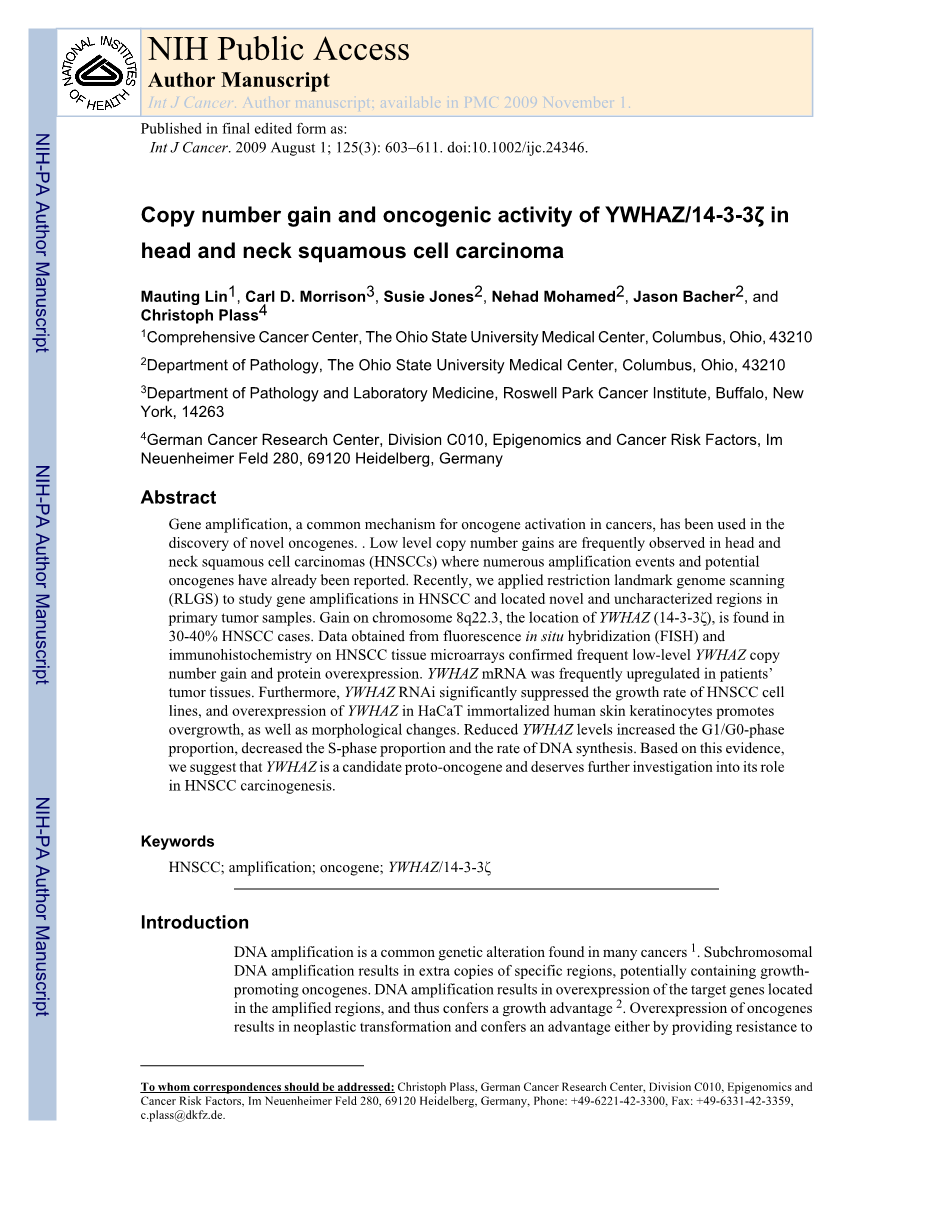 在头颈部鳞状细胞癌YWHAZ / 14-3-3zeta;拷贝数增加和致癌活性