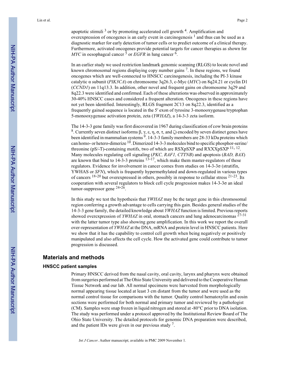 在许多癌症中发现DNA扩增是一种常见的基因变化1。亚染色体单位是DNA特定区域的放大导致额外的副本,,可能包含增长促进致癌基因。DNA扩增结果在目标基因位于放大区域的超表达,从而赋予生长优势2。致癌基因的超表达导致肿瘤转换和赋予的优势通过提供抗凋亡刺激3或促进加速细胞生长4。放大在致癌作用和致癌基因的超表达是一个早期事件1,因此可以作为诊断早期发现肿瘤细胞的标志或预测结果的临床治疗。此外,激活癌基因为癌症治疗提供潜在目标如图所示在食道癌MYC或在肺癌表皮生长因子受体5,6。在早期的研究中,我们使用限制具有里程碑意义的基因组扫描(针对)定位小说和已知的染色体区域显示拷贝数增加7。在这些地区,我们发现致癌基因,人脉广泛的HNSCC致癌作用,包括PI-3激酶催化alpha;亚基(PIK3CA)染色体3 q26.3,原癌基因(MYC)8 q24.21或细胞周期蛋白D1(CCND1)q13.3 11日。此外,其他特异和频繁上涨3 q29和8号染色体上q22.3被识别和确认。这些改变在大约30 - 40% HNSCC病例和认为是频繁变更。致癌基因在这些地区尚未确定。趣的是,针对片段2 c13 q22.3 8日,确认为经常获得序列位于5′外显子的酪氨酸单氧酶/色氨酸5-monooxygenase激活蛋白,zeta(YWHAZ)14-3-3zeta;同种型。