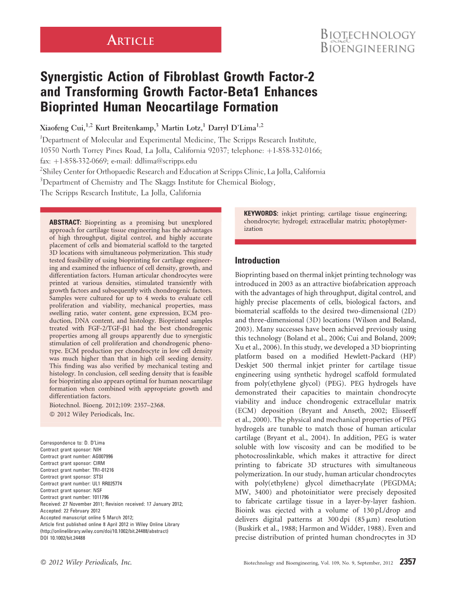 FGF-2与TGF-beta;1协同促进生物打印人均一性新生软骨形成