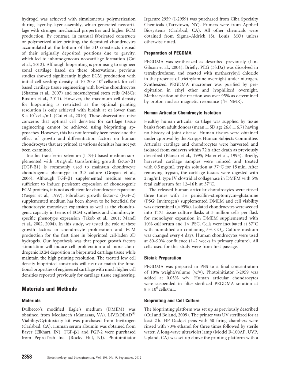 胰岛素-铁传递蛋白-硒(ITS )基础培养基,含10ng/mL TGF-beta;1,能够在3D培养中维持软骨细胞表型(Grogan et al., 2006)。虽然TGF-beta;1补充培养基对于维持软骨形成过程中ECM蛋白的表达似乎是充足的,但是不能有效促进软骨细胞的增殖与扩增(Yaeger et al., 1997)。成纤维细胞生长因子-2(FGF-2)补充培养基被证实能够有效促进软骨细胞单层增殖和软骨形成(Jakob et al., 2001; Mandl et al., 2002, 2004)。在本研究中,我们第一次检测了在生物打印的包含细胞的3D水凝胶中这些生长因子在软骨细胞增殖过程中所扮演的角色以及ECM产量。我们的猜想是在生物打印软骨组织工程中,使用合适的生长因子进行刺激,能够诱导软骨细胞增殖,提高ECM产量,同时保证高的打印分辨率。处理后的低细胞密度生物打印结构体将接近或匹配工程软骨的功能特性。