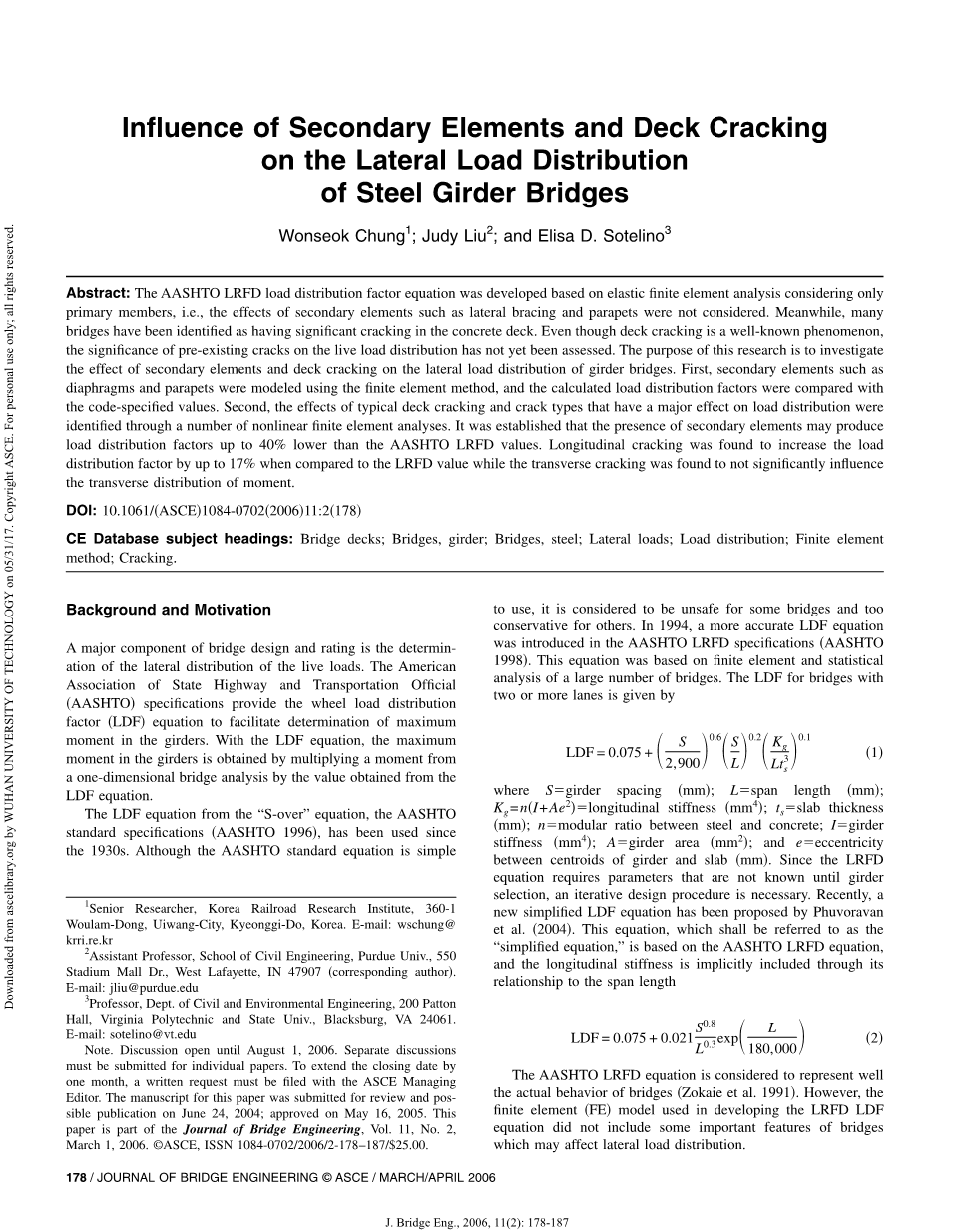 AASHTO LRFD公式被认为可以很好地代表桥梁Zokaie实际行为。然而,这用于开发LRFD LDF方程的FE方程没有包括桥梁一些可能影响横向载荷分布的重要参数。