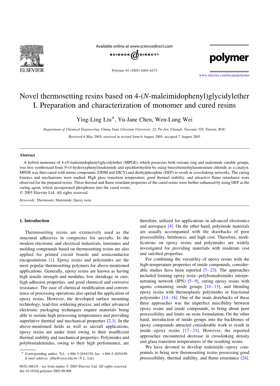 结合环氧树脂的多功能性高温性能的酰亚胺化合物,具有相当多的研究报道[5-23]。方法包括形成环氧树脂 - 聚双马来酰亚胺互穿网络(IPN)[5-9],固化环氧树脂含有酰亚胺基团的试剂[10-13],以及共混环氧树脂与热塑性聚酰亚胺或功能性聚酰亚胺[14-16]。这三种方法的主要缺点之一是不完全混溶性环氧树脂和酰亚胺化合物,造成差加工性和对树脂配方的限制。 在另一方面,酰亚胺基引入到骨架中环氧化合物吸引了合适的工作,导致酰亚胺 - 环氧树脂[17-23]。但是,报道的方法交联密度降低和所得树脂的玻璃化转变温度。我们致力于开发马来酰亚胺 - 环氧化合物,带来新的热固性树脂加工性,热稳定性和阻燃性[24]。在这项工作中,含有环氧乙烷环的杂化单体并从N-(4-羟基苯基)马来酰亚胺和表氯醇合成马来酰亚胺基团。 混合单体然后用常规胺固化进行固化剂(4,4-二氨基二苯基甲烷(DDM)和二氰基二酰胺(DICY))和热潜伏性固化剂亚磷酸二乙酯(DEP)[25]。 环氧乙烷和马来酰亚胺基团参与固化反应形成高度交联网络。 固化的动力学反应和热表征制备树脂。 热稳定性和火焰延迟[16,24]固化树脂明显通过并入马来酰亚胺结构来增强。此外,其中由于树脂用DEP固化的磷元素掺入,观察到极高的阻燃性。