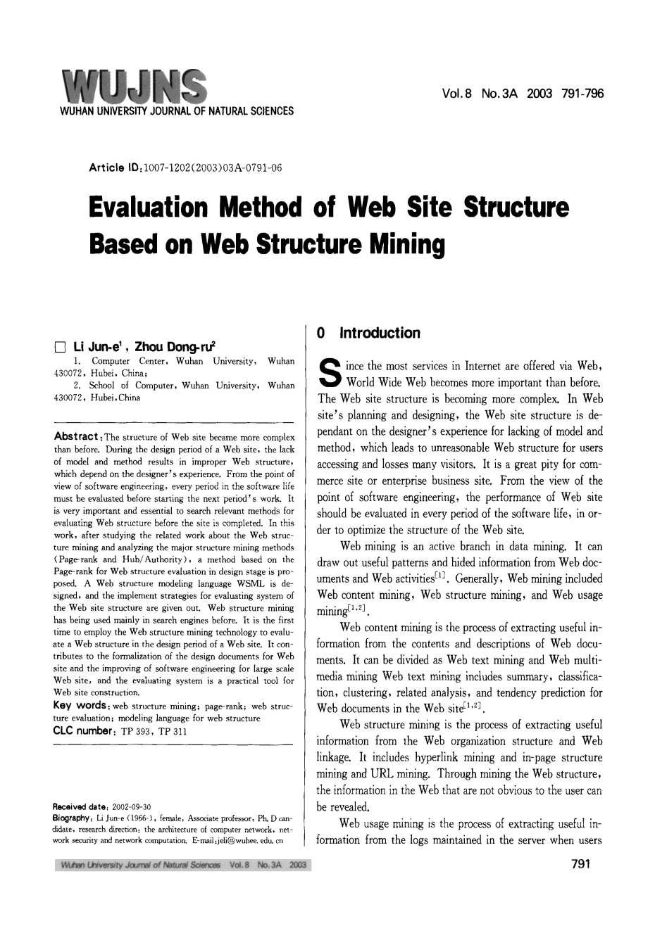 从软件工程的角度来看,网站的性能应该在软件生命周期的每一个阶段进行评估,以优化网站的结构。网络挖掘是数据挖掘中的一个活跃的分支。它可以从Web文档和Web活动中提取有用的模式和隐藏的信息。通常,Web挖掘包括Web内容挖掘,Web结构挖掘和Web使用挖掘[1,2] .Web内容挖掘是从Web文档的内容和描述中提取有用信息的过程。它可以分为Web文本挖掘和Web多媒体挖掘。Web文本挖掘包括网站中的Web文档的摘要,分类,聚类,相关分析和趋势预测。