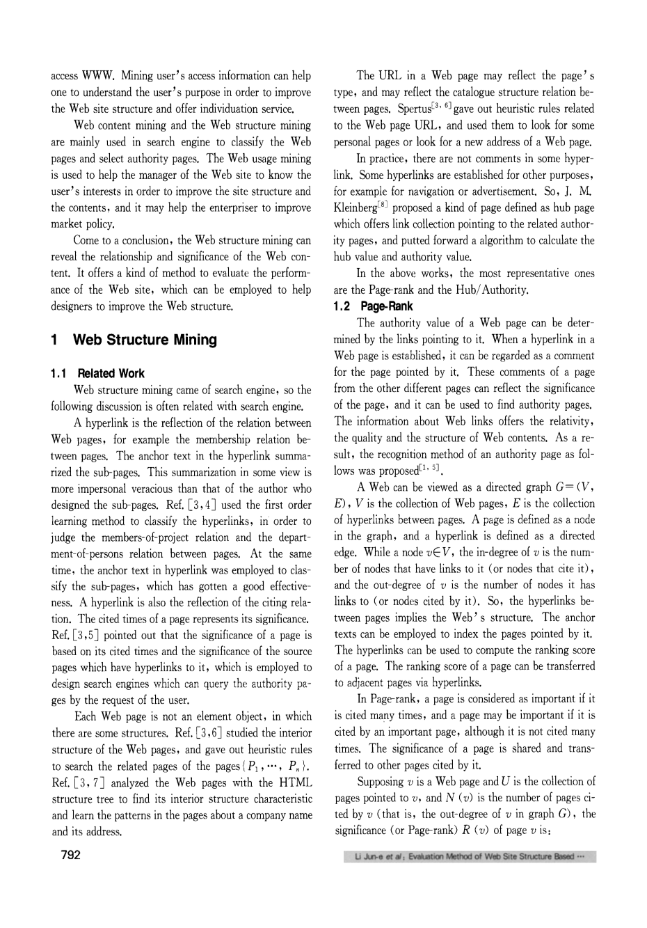 超链接也是引用关系的反映。页面的引用次数表示其意义。 [3,5]指出,页面的重要性是基于其引用的时间和源页面的重要性,其具有超链接,用于设计可以通过请求查询权限页面的搜索引擎user.Each网页不是元素对象,其中有一些结构。参考文献[3,6]研究了网页的内部结构,并给出了启发式规则来搜索页面的相关页面.Ref。[3,7] 使用HTML结构树来查找其内部结构特征,并了解关于公司名称及其地址的页面中的模式。