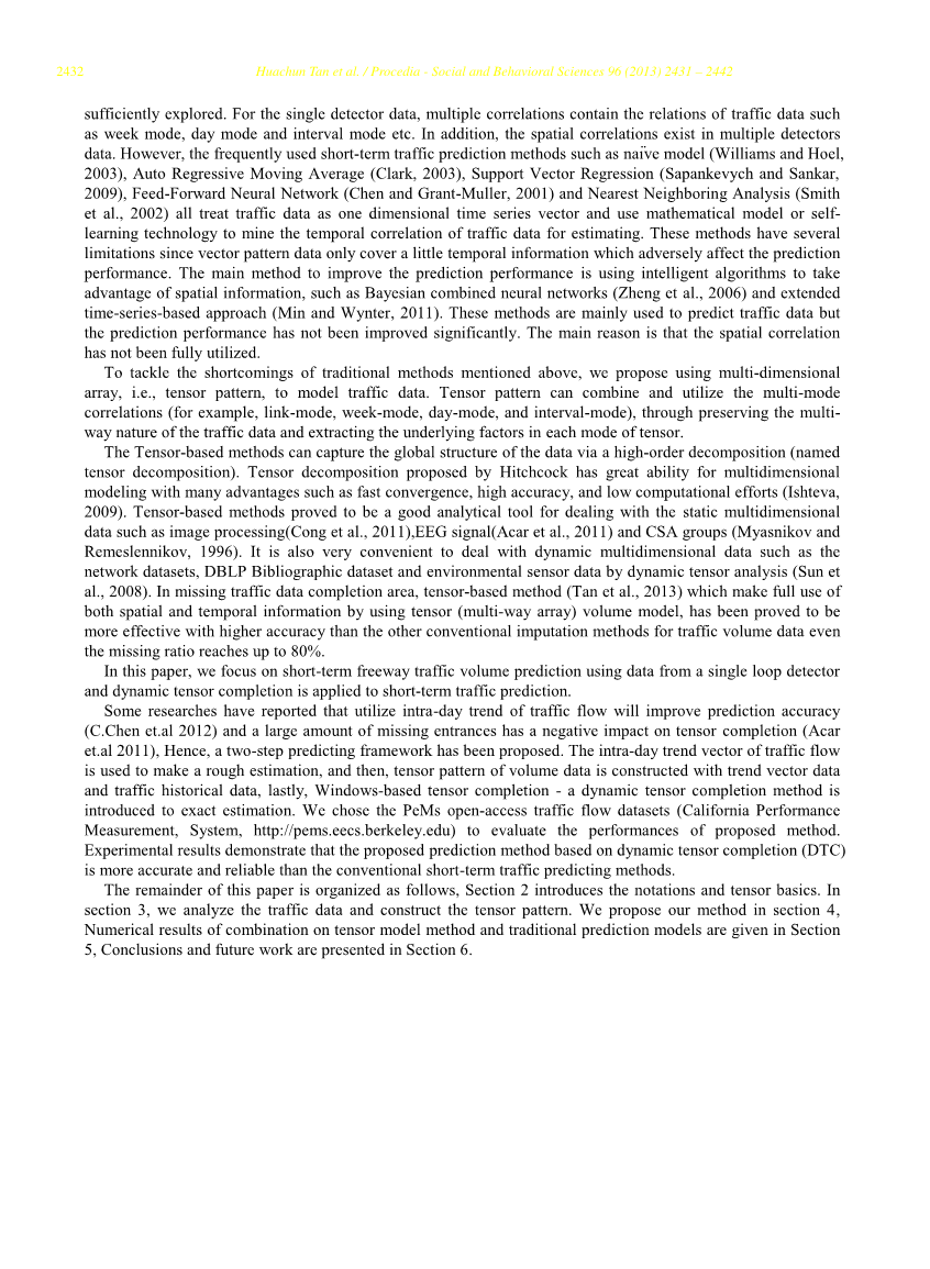 一些研究报告说,利用交通流量的日内趋势将提高预测准确性(C.Chen等人2012),大量失踪的入口对张量完成有负面影响(Acaret.al ,2011)。因此,已经提出了两步预测框架。使用交通流量的日内趋势向量进行粗略估计,然后利用趋势向量数据和交通历史数据构建体数据的张量模式,最后,基于Windows的张量完成-动态张量完成方法引入准确估计。我们选择了PeMs开放访问交通流量数据集(California Performance Measurement,System,http://pems.eecs.