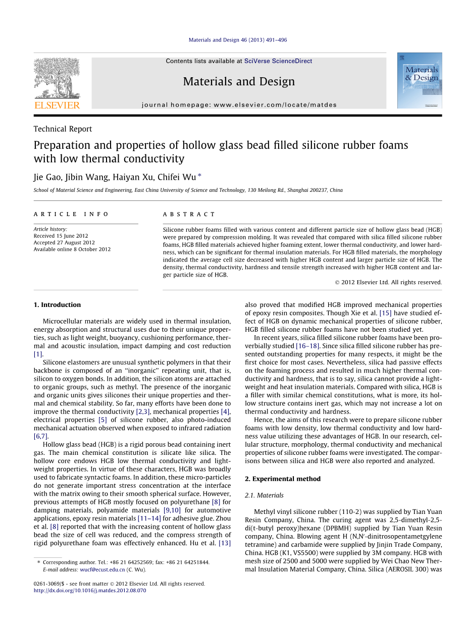 摘要:不同含量,不同粒径的空心玻璃微珠((HGB))填充硅橡胶泡沫材料是经过平板硫化法制得的。和二氧化硅填充硅橡胶泡沫材料相比,HGB填充材料发泡程度高,热导率低,硬度低,可成为一种重要的保温隔热材料。对于HGB填充材料而言,随着空心玻璃微珠含量,粒径的增大,材料中的平均孔隙尺寸降低;密度、导热系数、硬度、抗拉强度提高。