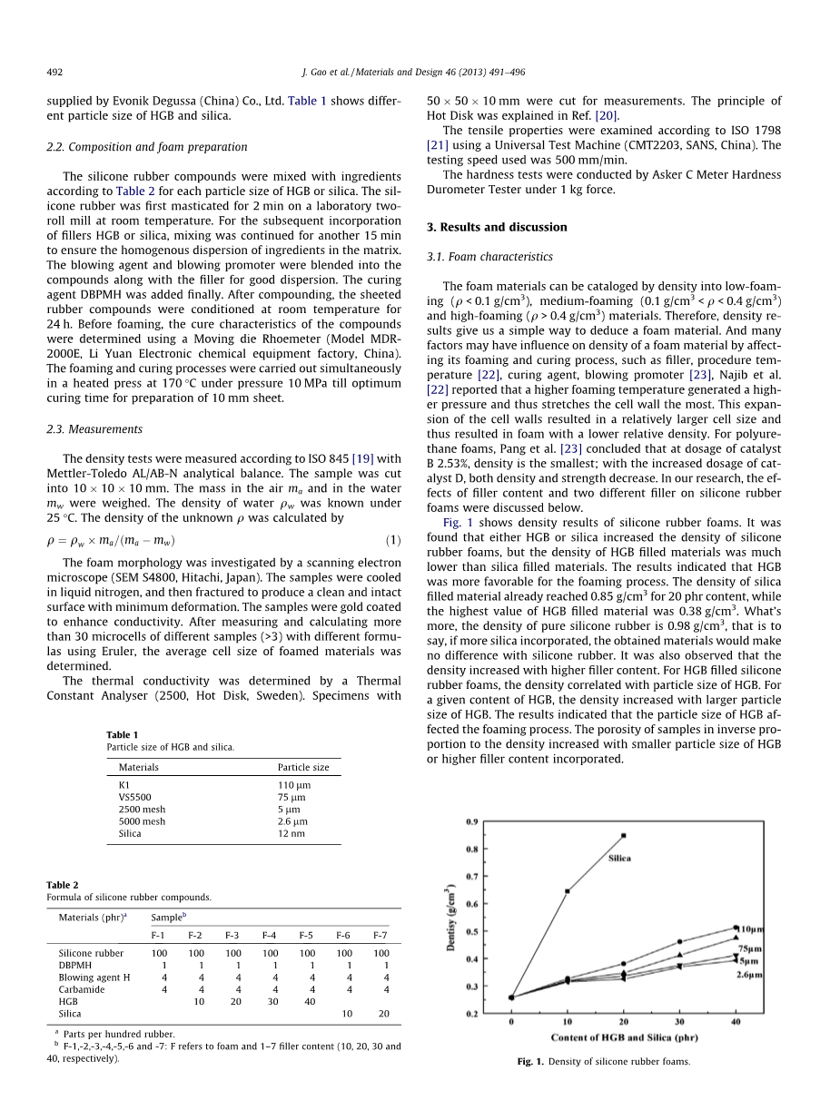 甲基乙烯基硅橡胶(110-2),2,5-叔丁基过氧乙烷硫化剂由中国田原树脂公司提供。发泡剂由中国津津贸易公司提供。HGB(K1,vs5500)是由3M公司提供。粒度2500和5000的HGB由中国魏超新型保温材料公司提供。二氧化硅(AEROSIL 300)是由Evonik Degussa(中国)有限公司提供。表1显示粒径大小不同的二氧化硅和HGB。