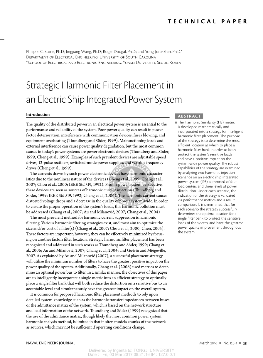 这一战略的目的是双重的。必须指出最有效和高效过滤器的位置(1)确保传递到敏感负荷供电质量(S),和(2)降低电能质量退化系统水平宽。实现这两个目标,第二,最有效的一个过滤器被认为是在可接受的最高功率分配模块的层次结构。每个PDM供电多负载供电更低一级的PDM(S)。因此,PDM是最有效的位置为一个单一的滤波器具有最大影响最大的节点数。此外,对PDM的滤波器放置水平越高,越大的节点数,将不能通过滤波器组。然而,如果将滤波器组的最高水平也没有造成更大的电能质量和高效的为系统的敏感负载,它仍然是不成功的。因此,该策略的目的是确定最高级别滤波器组可以放置和仍然有效的保护敏感负载的目的。