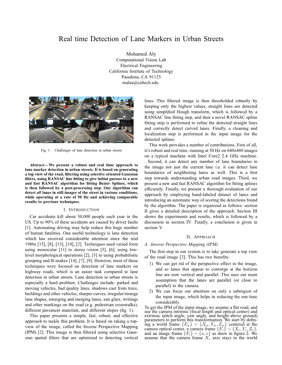 本文提出了一个简单、快速、强大、有效的方法来解决这个问题。它基于图像的俯视图,我们称它为反向透视映射(IPM)。通过使用经过优化以检测垂直线的选择性高斯空间滤波器对该图像进行滤波。然后通过将该滤波后的图像鲁棒性地阈值化,仅保持其最高值,使用简化的霍夫变换检测直线,接下来是RANSAC线拟合步骤,执行新的RANSAC样条拟合步骤以细化检测到的直线并且正确地检测弯曲的车道。最后,在检测到的样条的输入图像中执行清洁和定位操作。