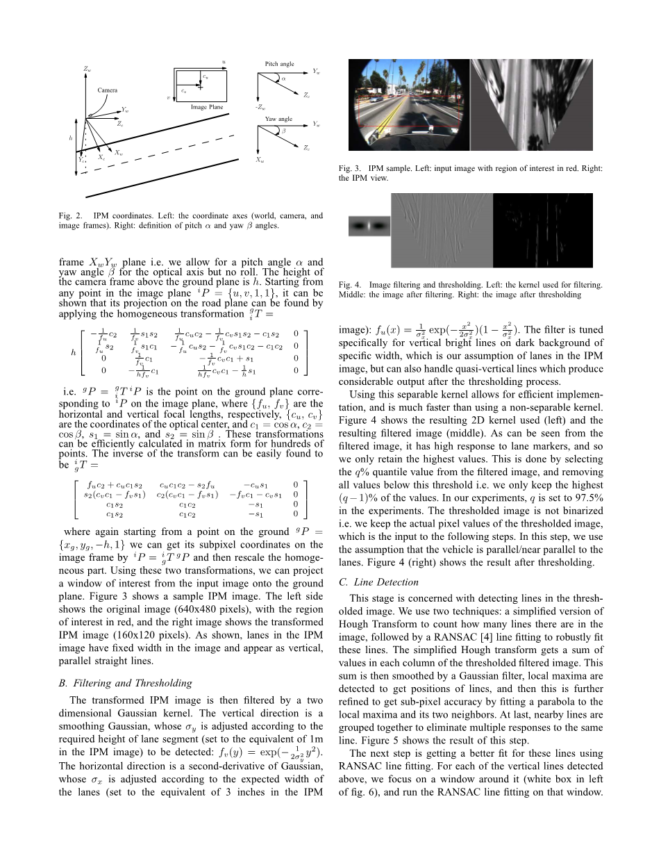 获得其在图像帧上的子像素坐标,然后重新缩放均匀部分。使用这两个变换,我们可以将感兴趣的窗口从输入图像投影到地平面上。图3显示了一个示例IPM图像。左侧示出原始图像(640times;480像素),感兴趣区域为红色,右侧图像示出变换的IPM图像(160times;120像素)。 如图所示,IPM图像中的通道在图像中具有固定的宽度,并且表现为垂直,平行的直线。
