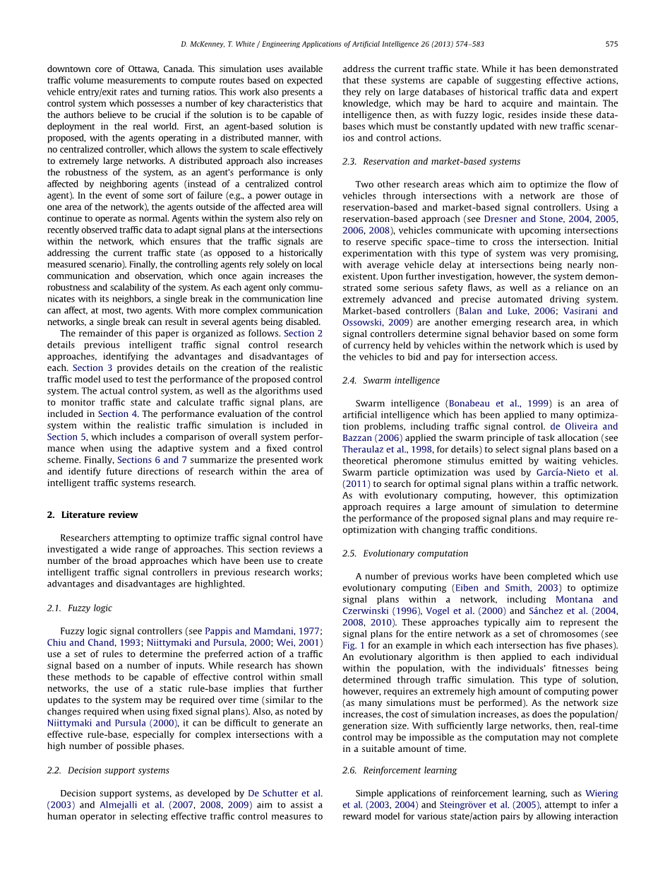 群体智能(Bonabeau 等人,1999)是一个领域人工智能已被应用于许多优化 - 包括交通信号控制。 de Oliveira和Bazzan(2006)应用了任务分配的群体原则(Theraulaz等人。1998,)以选择基于a的信号计划等待车辆发出的理论信息素刺激。Swarm粒子优化由Garcıa-Nieto等人使用。(2011)在交通网络中寻找最佳信号计划。然而,与进化计算相比,这种优化方法需要大量的模拟来确定所提出的信号方案的性能,改变交通条件的优化。