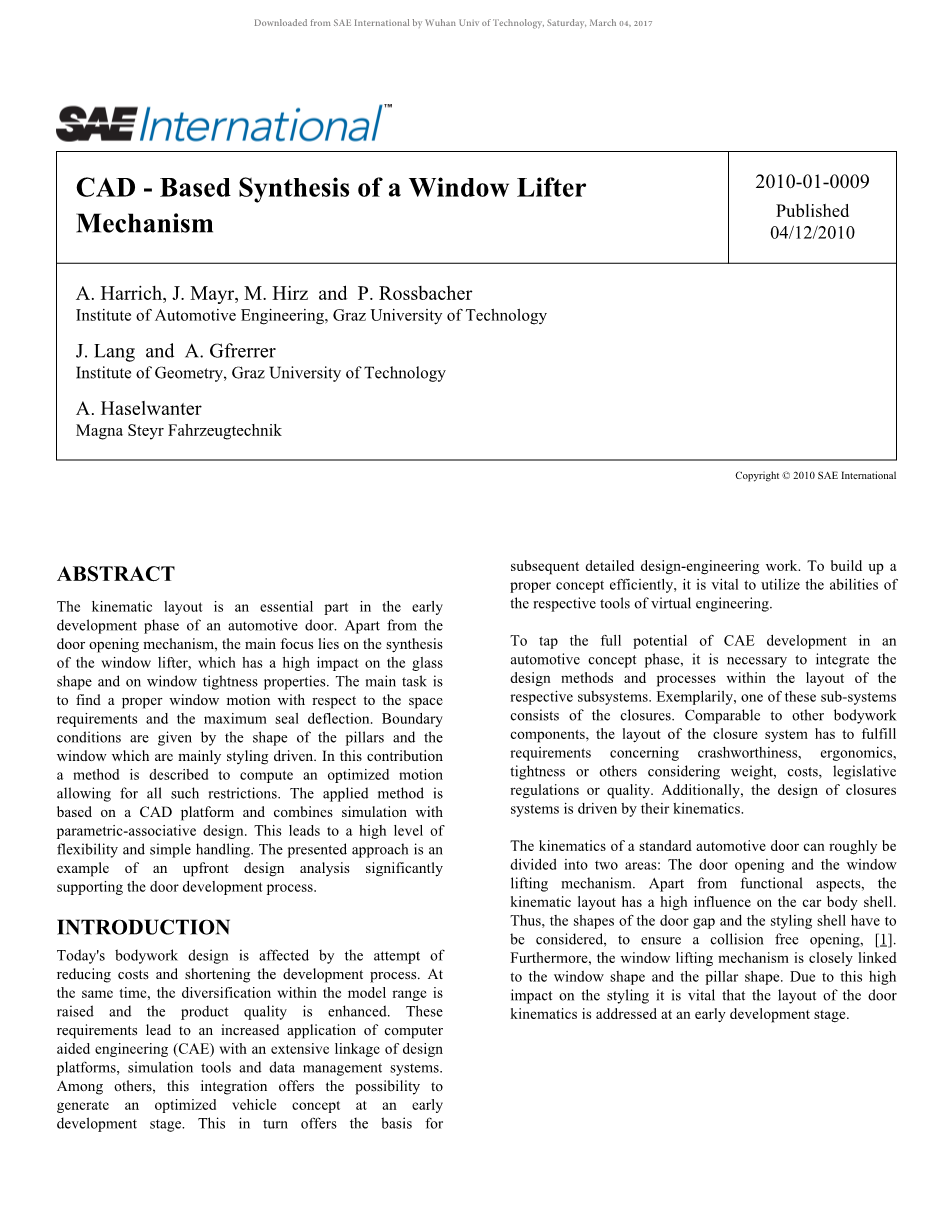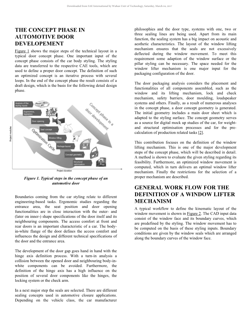 其贡献集中在车窗玻璃升降机构的设计上。这是概念设计阶段的主要发展步骤之一,这是将要详细描述的。有一种方法被用来评估与给定造型有关的可行性。此外,车窗运动的优化被计算,这反过来又提供了一个最佳的车窗升降机构。最终一个适当机制的选择的限制被列出。