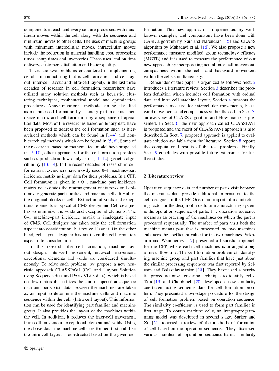 操作序列数据和经过多个设备加工的零件数量为CFP的单元设计者提供了额外的信息。在单元生产制造系统的设计中,一个很重要的生产因素是零件的操作顺序。操作顺序指的是零件需要按照设备的排列顺序进行有序的加工。经过多个设备加工的零件数量指的是一个零件经过了两台设备加工,从而提升了两台设备的价值系数。Vakharia和Wemmerlov[17]介绍了关于CFP的一种启发式算法,这种情况下每个单元设备都沿着流水线排列。Selvam和Balasubramanian[18]首先报告了关于以相似加工顺序来确定设备成组和零件家族的单元成组问题。他们用启发式步骤代替技术来确定单元。Tam[19]和Choobineh[20]利用顺序数据开发了一种新的相似系数来解决单元成组问题。他们基于操作顺序提出了一种两阶段步骤来解决单元成组设计问题。相似系数用来在第一阶段建立零件家族。为了获得设备单元,在第二阶段开发了一个整数规划模型。Sarker和Xu[21]基于操作顺序做出了一次关于单元成组方法的评论。他们探讨了大量基于操作顺序的相似系数,数学项目,物料流动分析方法,网络分析和启发。Boulif和Atif[22]利用图表分割开发了一种分支和限度提升的遗传算法来解决单元成组问题。他们考虑了实际生产数据。Liao[23]开发了一个三阶段步骤来寻找最有路径,单元之间的布置和设备单元。Heragu和Kakutur[24]开发了一种模拟退火算法来整合设备成组和单元布置问题。Lee和Chian[25]介绍了设备成组和布置问题的结合。Chiang和Lee[26]基于遗传算法对单元成组问题进行了考虑。Houshyar和McGinnis[27]描述了一种图表方法来解决单元布置中的设施分配,并使WIP旅行距离最小。Afentakis[28]测试了单向单元布置问题。Kinetal[29]开发了一种两阶段的启发式算法来解决单元成组问题。他们测试了另外的零件路线和设备排序。Yin和Yasuda[30]利用排列比例重新考虑了普遍的相似系数。Yinetal[31]基于物料流动解决了生产单元成组。Xambre和Vilarinho[32]利用多个相同的设备设计了一种模拟退火方法来解决制造单元成组。Nair和Narendran[15]利用序列数据开发了一种新的种群算法CASE来解决单元成组。在最近几年,一些研究综合了单元成组问题和单元布置问题来适应现实的生产系统。Huetal[33]利用遗传算法同时考虑了单元布置设计和流动运动结构。Nourietal[34]利用序列数据提出了一种细菌觅食算法来解决单元成组问题。Mahdavi,Shirazi和Paydar[35]开发了一种基于流动矩阵的启发式算法来确定最佳的单元成组和设备单元布置。Ahietal[36]基于TOPSIS解决了多属性决策概念,从而确定单元成组和单元内部设备排列的问题。Wuetal[37]开发了一种分层的GA来解决单元成组和单元布置模型。同时他们还开发出一种多目标模型来解决单元成组问题。Wuetal[38]介绍了一种能合并单元构造、设备布置和日程安排的遗传算法。Wuetal[39]利用模拟退火算法,通过另外的路线解决了单元成组问题。Chanetal[40]开发了两阶段的方法来解决单元成组和单元布置问题。Chanetal[41]同时也整合了CFP、设备布置和单元布置问题。他们考虑了生产因素如操作顺序、另外的加工路线和产量。Fabriborzetal[42]开发了一种类电磁算法来解决单元成组和布置问题。Changetal[43]设计了两阶段的数学模型来整合单元成组、单元布置和操作顺序。Mahdavietal[44]介绍了一种新的整合数学模型,它同时考虑了单元成组和单元布置。Mahdavi和Mahadevan[16]开发了一种新的算法CLASS,它能同时找出单元成组和单元布置。他们利用操作序列数据作为输入来确定设备单元和单元内的设备布置。他们没有关注单元之间的运动、异常和无效的因素。他们只考虑了特殊的情况.Lee和Ahn[45]提出了一种叫做成组技术效率的新的绩效测试方法,它基于序列数据来评估方法。他们同时合并了实际的单元之间的运动和单元内部的紧密度,将GT效率作为目标数量标准。他们没有考虑零件在单元内部的反向运动。在这篇文章中将提出一种新的启发式方法CLASSPAVI,它将用来合并CIS中单元成组问题和布置设计,同时还将最小化设备单元成组问题中的无效因素数量、异常因素数量、单元内部的运动和单元之间的运动。
