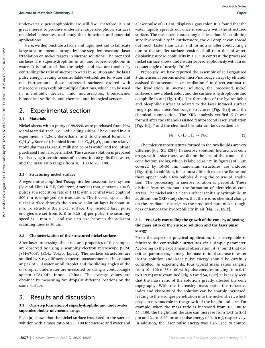 在两种液体中形成的微纳米结构有十分大的区别(图1 S1,ESI)。在蔗糖溶液形成了尺寸(这里我们定义锥形尺寸为锥形底面半径,在图中标为“R”)为3mu;m,且表面布满约10—30nm绒毛结构的分级锥形阵列。此外在激光辐射加工过程中只有少量的气泡,并且很难看到激光焦斑。在蔗糖溶液中的整个加工过程很安静。这一明显的特征促进了分级微锥形阵列的形成。洁净的镍表面是亲水的,XRD分析也表明被辐照的镍表面没有发生化学改变[23],所以是激光诱导产生的纯净镍表面粗糙结构增加了其在空气中的亲水性。(图S2,ESI)