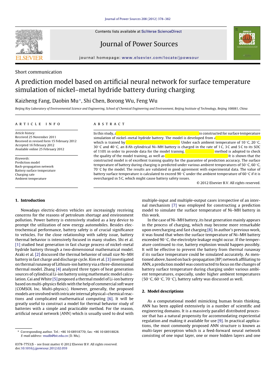 一种基于人工神经网络的预测模型,用于在充电过程中镍氢电池的表面温度模拟