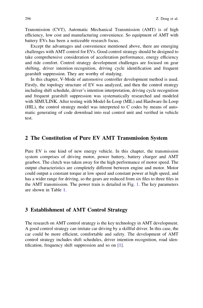 纯电动汽车是一种新能源汽车。在这一章中,传动系统包括驱动电机、电源电池、电池充电器和AMT变速箱。离合器能传递电机的高转速。汽车发动机和发电机之间的输出特性是完全不同的。电动机可以输出一个低速恒转矩和高速的恒功率,汽车有一个很大的变速范围,所以AMT变速器齿轮速从六挡变为三挡。传动系统在图1中有详细描述。关键参数在表1 中。