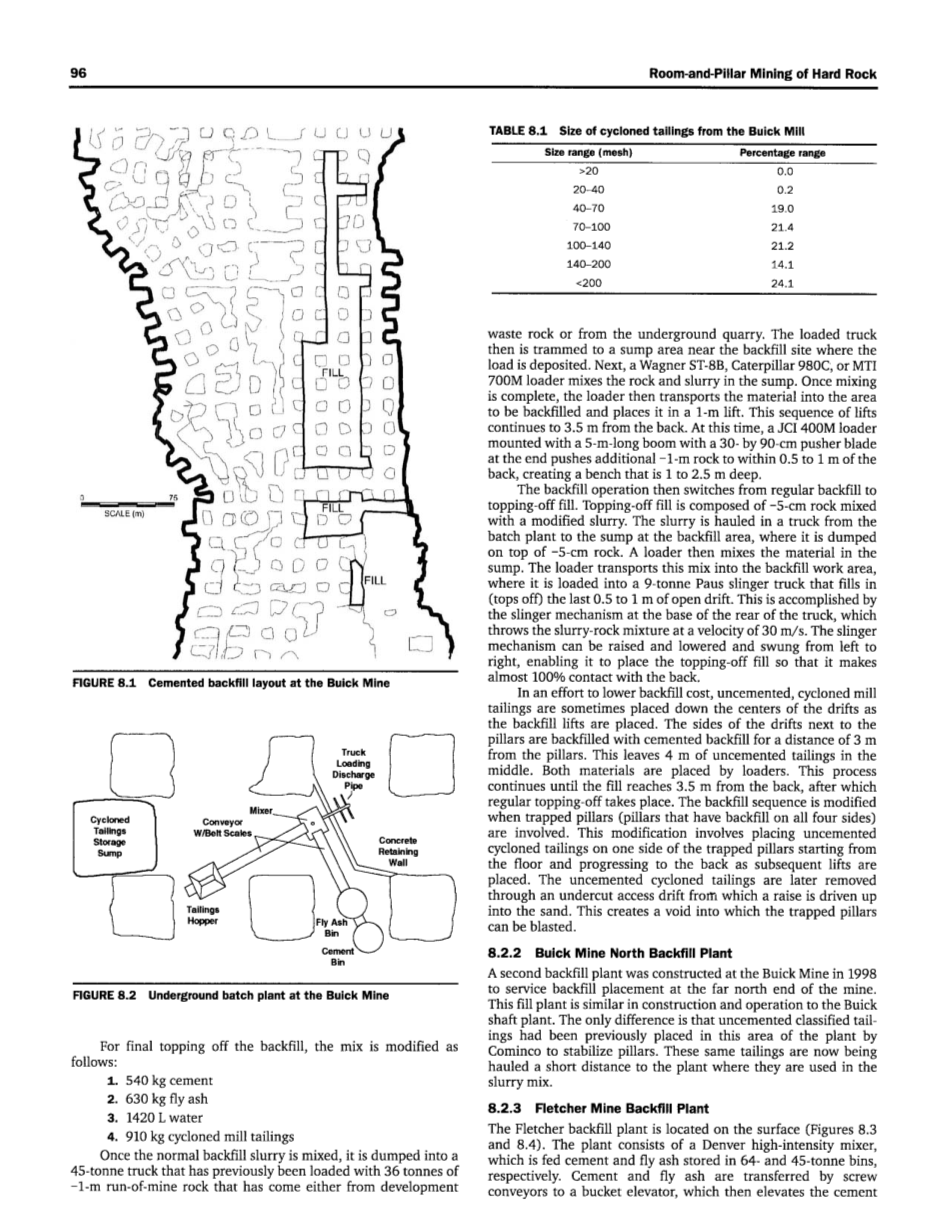 Buick矿山的第一个回填厂在1993年被投入使用。该工厂由一个8立方米的丹佛搅拌机组成,该搅拌机的进料由两条输送带输送,其中一条从两个容量为63吨的桶中输送水泥和飞灰,另一条从储料斗中输送旋风尾矿(图8.2)。水泥和飞灰通过一个直径为20cm,深度为305m的套管井,从地面被输送到地下仓。将旋风尾矿(表8.1)从表面下降到另一个直径为20cm的孔中,并沉积在水槽区域,在那里将水倾析出来。一旦旋风尾矿要进行干燥时,它们将被Caterpillar 966装载机拾起并送入尾料斗。搅拌机能在7分钟内循环搅拌好一批尾矿。对于一般的回填物,其浆料混合物由以下材料组成: