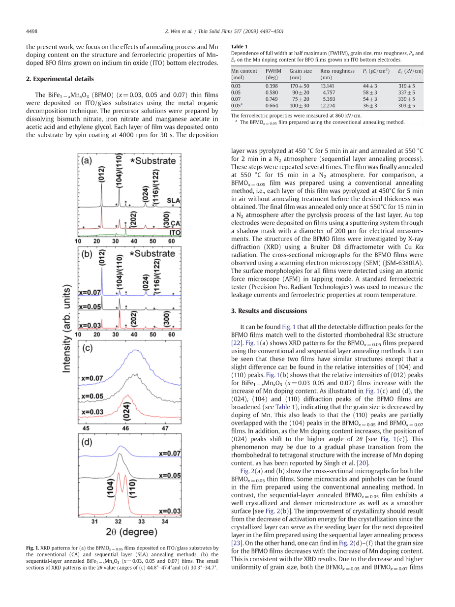 用金属有机分解法将BiFe1minus;xMnxO3(BFMO) (x=0.03,0.05和0.07)薄膜在氧化铟锡/玻璃基板上制备,通过X射线衍射分析,由于Mn的取代,BiFeO3薄膜结构发生变形。漏导电流测量表明Mn掺杂的含量是影响BFMO薄膜漏电流的主要因素。由于结晶性差,使用传统退火方式时,在x = 0.05的BFMO 薄膜中能观察到小的剩余极化(Pr)。经研究发现,逐层退火方法的BFMO薄膜的Pr值与(012)峰的强度以及氧空位和受体间的缺陷复合物的含量有关。