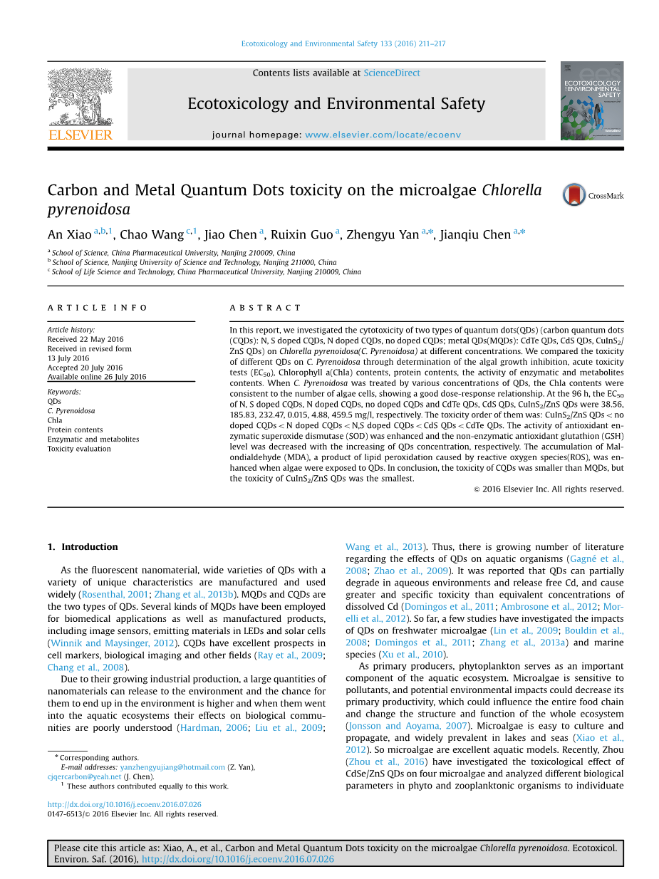 作为荧光纳米材料,许多有着独特特性的量子点被大量制造并且广泛地使用。其中量子点主要分为金属量子点和碳量子点。许多种金属量子点已经运用于生物医药材料和工业产品,包括图像传感器,LED灯里的发光材料和太阳电池等。碳量子点在细胞标记,生物成像和其他领域等有很大的前景。由于含量子点的工业产品持续增多,大量的纳米材料被释放到环境中,它们最终留在环境中的可能性很高。当它们进入水生生态系统时,它们对水生生物群体的作用还未可知。因此有关于量子点对水生生物的影响的文献越来越多。据研究表明,一些金属量子点在水环境中可以部分降解并释放出游离Cd2 ,造成比当量浓度的溶解Cd2 更大的毒性。到目前为止,几乎没有研究是关于量子点对淡水微藻类和海洋生物的影响的。