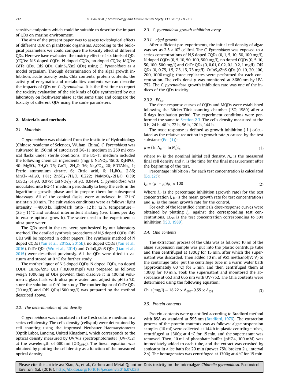 碳量子点和金属量子点的量效曲线是利用细胞计数器在对小球藻培养6天之后建立的。实验条件和2.3.1的相同。在0 h,24h,48h,72h,96h,120h,144h对细胞密度进行测量。毒性反应定义为由实验物质导致的生长速率的相对下降所体现出的生长抑制,公式为: