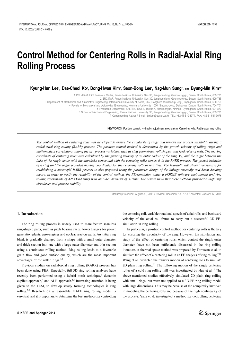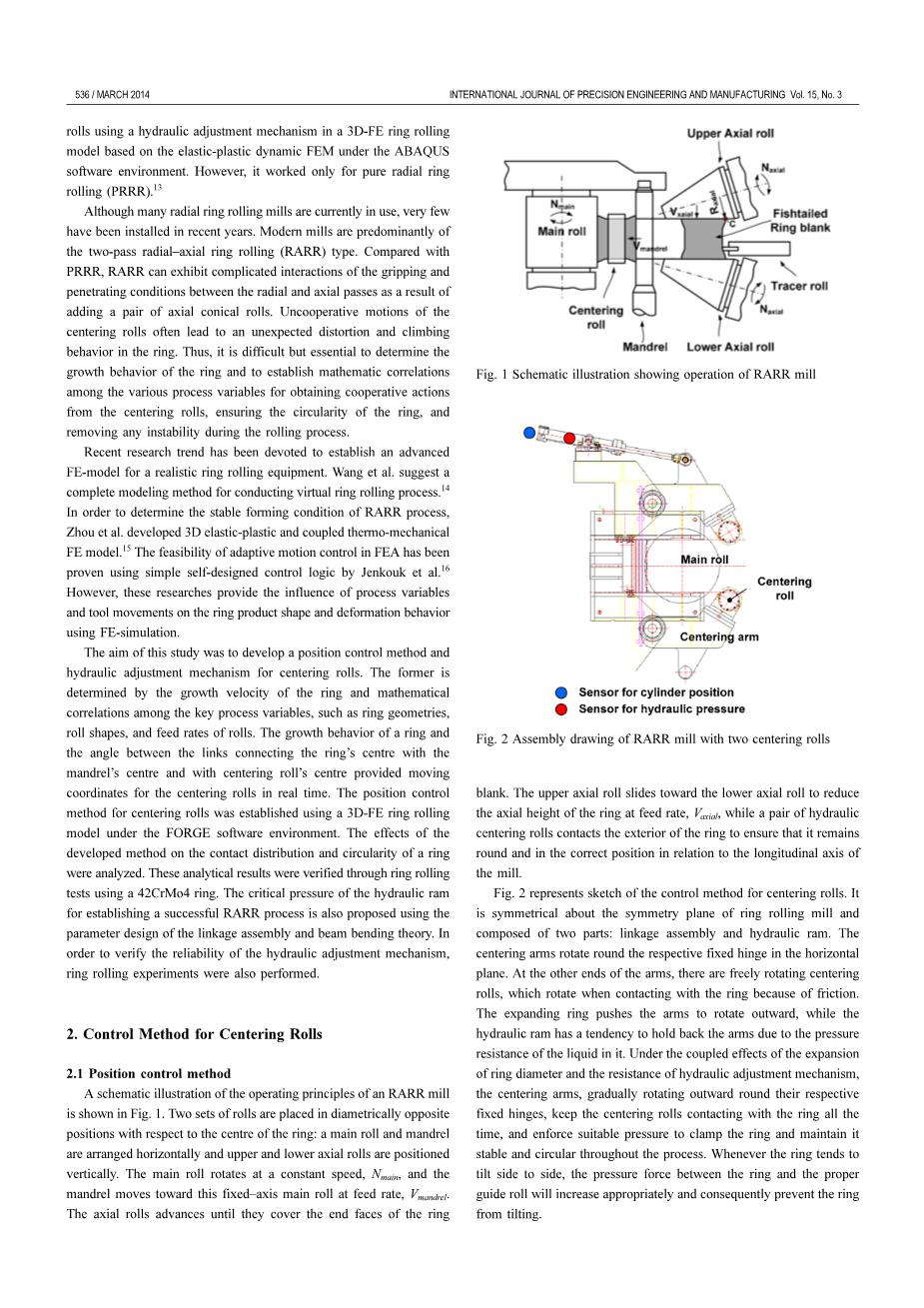 本研究的目的是为定心辊发展一个位置控制方法和液压调节机构。前者是由环的变化速度和关键过程变量之间的数学相关性,如环的几何形状,辊形,和进给速率的轧辊确定。环的变化过程和环的中心连接心轴的中心与定心辊中心的连接心轴的中心组成的夹角的变化为定心辊移动提供实时坐标。定心辊位置控制方法是在一个三维轧制模型软件环境下建立的。这种方法的影响在于通过对42CrMo4环进行轧制试验得到的这结果,对圆环的接触分布和圆度进行了分析。为了建立一个成功的双道径轴向辗环过程,利用连杆机构的参数设计和梁弯曲理论计算出了液压油缸的临界压力。同时为了验证液压调节机构的可靠性,还进行了环件轧制试验。