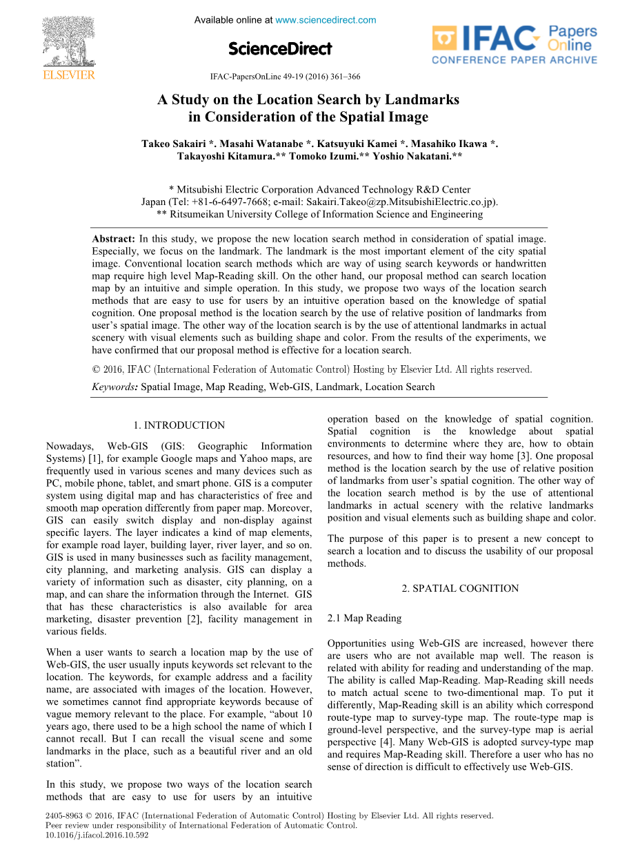 摘要:在本研究中,我们通过考虑空间图像提出了新的位置搜索方法。特别的是在于我们专注于地标性建筑。地标性建筑是城市空间图像中最重要的元素。使用搜索关键词或手写的地图的常规位置搜索方法需要高水平的地图阅读技能。另一方面,我们的提案方法可以通过直观和简单的操作搜索位置图。在本研究中,我们提出了基于空间认知的相关知识的直观操作,为用户提供了两种方便的位置搜索方法。第一种提案方法是通过使用地标的相对位置来进行位置搜索用户的空间图像。位置搜索的另一种方式是通过在实际景观中使用注意地标,并建立形状和颜色等视觉元素。从实验结果来看,我们已经确认我们的提案方法对于位置搜索是有效的。