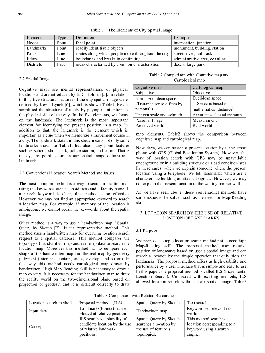 我们提出一个简单的位置搜索方法,不需要高超的地图阅读技能。提案方法基于用户的空间图像使用地标的相对位置,并且可以通过仅绘制地标的简单操作来搜索位置。提案方法通过简单易用的用户界面为我们提供了高可用性和高性能。在本文中,提案方法称为ILS(增量定位搜索)。 与现有方法相比,ILS允许位置搜索没有明确的空间图像。表3展示比较我们的提案方法和常规地图搜索方法。