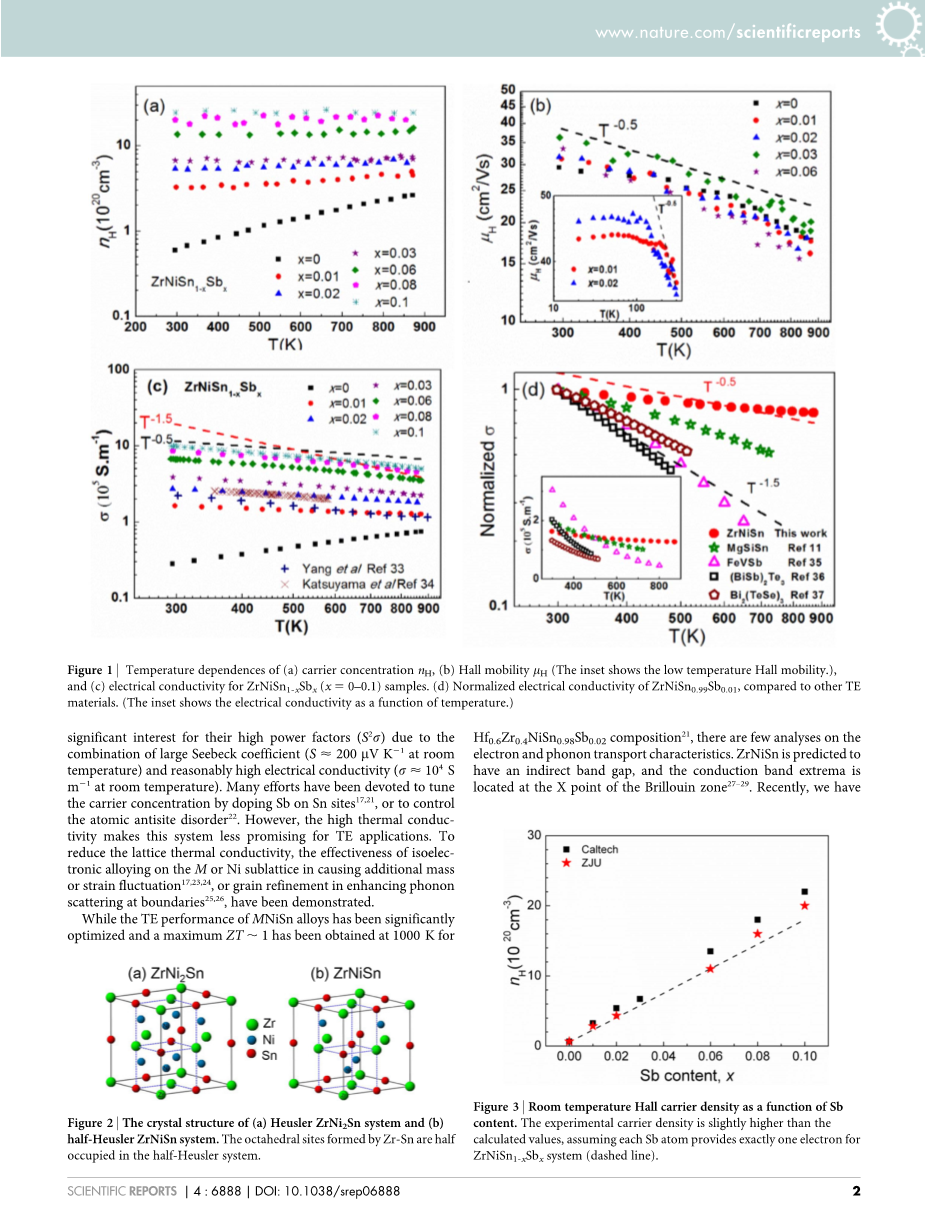另外,重掺杂ZrNiSn合金的电荷输运机制是以合金散射为主导的,而其他高性能热电材料多为声子散射占主导[10,11,31]。重度取代ZrNiSn合金(Hf取代Zr位,Pt取代Ni位)的合金散射占主导的电荷输运机制表现出mu;H~T-1/2依赖关系[30]。若要深入探讨ZrNiSn基的half-Heusler合金的电荷输运机制,需要研究未被取代的ZrNiSn合金的热电输运特性。
