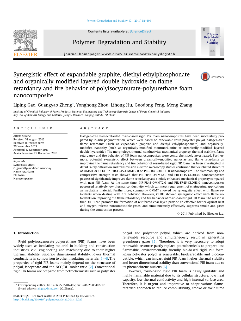 层状双氢氧化物(LDHs),也称为阴离子或水滑石粘土,由于其化学成分可调,易于合成,纯度高及其潜在的工业用途吸引了相当多的关注。在LDH里,氢氧化物层充斥着强烈的静电相互作用,导致不易形成表皮脱落或LDH夹层。通过改性带有机阴离子的LDH,层间距离增加,层变得更加亲有机基团,所以单体或聚合物分子之间可以更容易穿透层,使之适合作为纳米填料。剥落LDH层的聚合物/ LDH纳米复合材料有良好的力学性能和使热稳定性提高。许多研究人员研究了LDH与阻燃剂在阻燃性能上的协同效应,如乙烯-丙烯-二烯三元共聚物(EPDM)、乙烯-醋酸乙烯(EVA),聚乙烯醇(PVA),涂料,LDPE / EVA / HFMH / LDH、PP / EPDM / IFR / LDH和聚氨酯纳米复合材料体系。在我们之前的研究发现,未改性的层状双氢氧化物(Ni Al-LDH)与可膨胀石墨(EG)和三聚氰胺多磷酸盐(MPP)在提高树脂基硬质聚氨酯泡沫的阻燃性上显示协同效应。