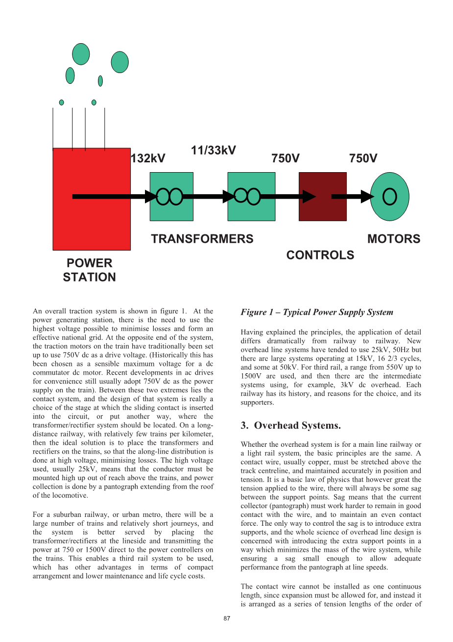 总体牵引系统如图1所示。在发电站,需要使用尽可能高的电压来最小化损耗并形成有效的国家电网。在系统的另一端,列车上的牵引电动机传统上设置为使用750V直流作为驱动电压。(历史上,这被选为直流换向器直流电动机的合理最大电压。交流驱动器的最新发展方便通常采用750V直流作为列车上的电源)。在这两个极之间是接触系统,该系统的设计实际上是滑动触点插入电路的阶段的选择,或换句话说,变压器/整流器系统应该位于何处。在长途铁路上,每公里火车相对较少,所以理想的解决方案是将变压器和整流器放在火车上,使得沿线分布在高压下完成,最大限度地减少损耗。所使用的高压(通常为25kV)意味着导体必须安装在火车上方的高处,并且从机车车顶延伸的受电弓进行集电。