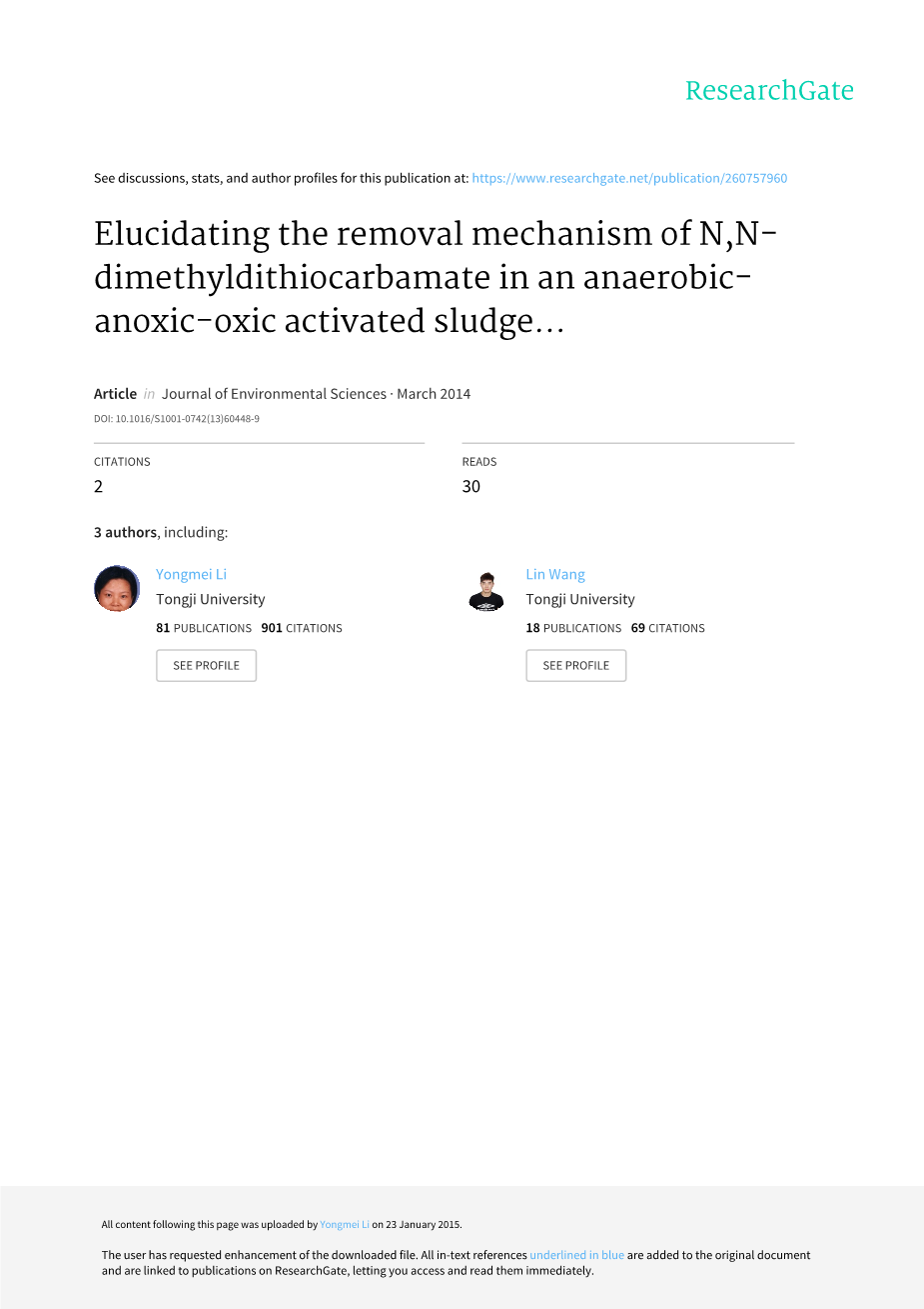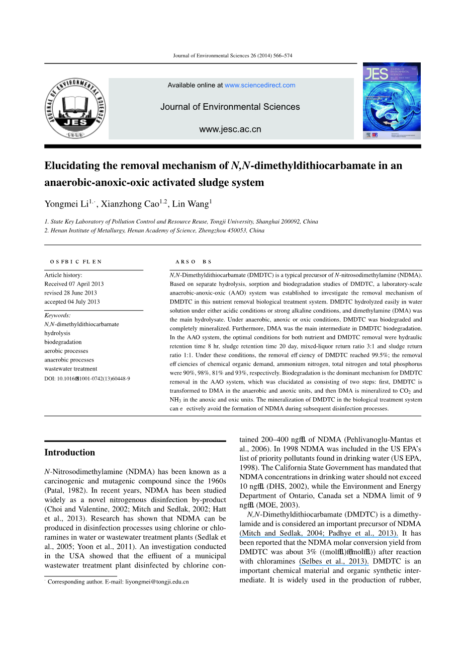 阐明N,N-二甲基二硫代氨基甲酸酯在A/A/O活性污泥中的去除机理