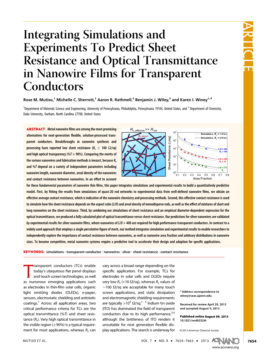 在本文中,我们介绍了薄膜金属纳米线网格的方阻在纳米线尺寸(长度和直径),尺寸分散度和面密度的作用下的第一次模拟。我们调整模拟中的单个参数——两个纳米线之间的有效平均接触电阻(Rc_effctive),来与一定面密度下的纳米线膜方阻的实验值相对应。那么。通过使用这种合适的参数,我们的模拟可以定量地预测在纳米线尺寸,尺寸分散度和面密度的条件下的方阻。而且,通过结合我们的方阻模拟和最近公布的光透射经验表达式,我们报告了光透过率与方阻的第一个完全计算图,这两个参数定义了透明导体的性能。对于这里研究的银纳米线,我们发现在适当的纳米线密度下,低方阻(Rs le;100 Omega;/sq)需要达到Rc_effective =2kOmega;和L/Dgt; 100。此外,我们观察到较高的长径比棒(L/Dgt; 400)和适中的面密度可以同时优化光透射率和薄膜方阻达到Rs =100Omega;/ sq,%Tgt;90%。这些预测与已发表的高性能银纳米线的实验结果一致,这表明了我们的模拟有能力捕捉重要的实验趋势。我们的综合模拟和实验方法得到了Rc_effective,从而使不同分组的纳米线或由不同手段制造的网格能够在一定程度上以纳米线的尺寸和网格的面密度去卷积的方式进行比较。这种设定好方向有助于在金属纳米线网格中建立一个全面详尽的框架,更好地理解结构性能关系,从而指导未来的实验研究,促进这些有潜力的体系发展。