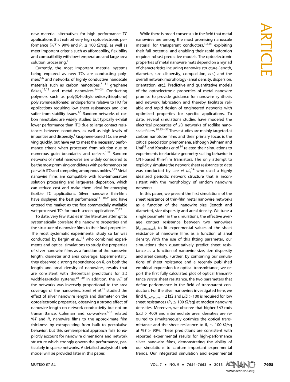 图2中长径比对Rs的强相关性从定性上看与高长径比的棒的渗滤研究是一致的,从定量上看与金属纳米线的实验是一致的。在无宽2D棒的理论中,形成渗透网格所需的棒的临界数密度(Nc)与(Nc prop;1/)成反比。50因此,较长的棒产生更好连接的网络,使得更低数量密度的棒有着更好的电导率 ,这与我们在图2中的发现一致。在适当的纳米线密度下,Rsle;100Omega;/sq要求L/Dgt; 100。这一发现与Bergin等人最近的实验结果一致,他们观察到L/D = 37和73的银纳米线性能非常差,而L/D =182和375的银纳米线性能良好。相比之下,其他研究人员(14,16)也报道了具有令人惊讶的适度长径比L/Dasymp;80的银纳米线有这相似的低方阻,但是这里的L分布是不对称的,更偏向较大的长度。相对于具有相同数量平均长度的单分散或尺寸分布均衡,几根较高长径比的纳米线可以明显增加网格电导率。本文稍后将讨论纳米线的尺寸