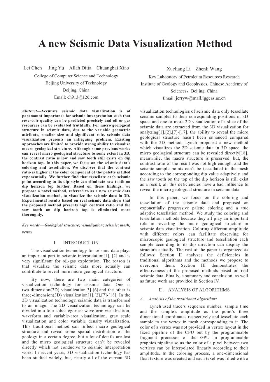 目前,地震数据可视化技术主要有两大类。一个是二维(2D)可视化[3] - [6],另一个是三维(3D)可视化[1],[2],[7] - [18]。在二维可视化技术中,地震数据被转换为图像。 2D可视化技术可以分为四个子类别:波形可视化,波形和可变区域可视化,灰度可视化和颜色变量密度可视化。这种传统方法可以反映宏观地质构造,在一定程度上揭示地质学的一些空间分布,但很多细节将会丢失,不能直接揭示微观地质结构,不利于地震数据解读工作。 近年来,3D可视化技术得到了广泛的研究,但是现在几乎所有的地震数据3D可视化技术都只能将地震样本细分为三维空间中的相应位置以及地震数据片段的一个或多个二维可视化 从3D可视化中提取分析[1],[2],[7] - [17],与2D方法相比,显示微观地质结构的能力没有得到提高。林奇提出了一种在3D空间中可视化二维地震数据的新方法,可以直接显示微观地质结构[18],同时宏观结构得以保留,但是对比度不够高, 地震采样点不能自适应地根据相应的倾斜值细分到网格上,因此仍然存在倾角水平顶部的锯齿,所有这些缺陷在地震数据解读工作中对揭示微观地质结构有不良影响。