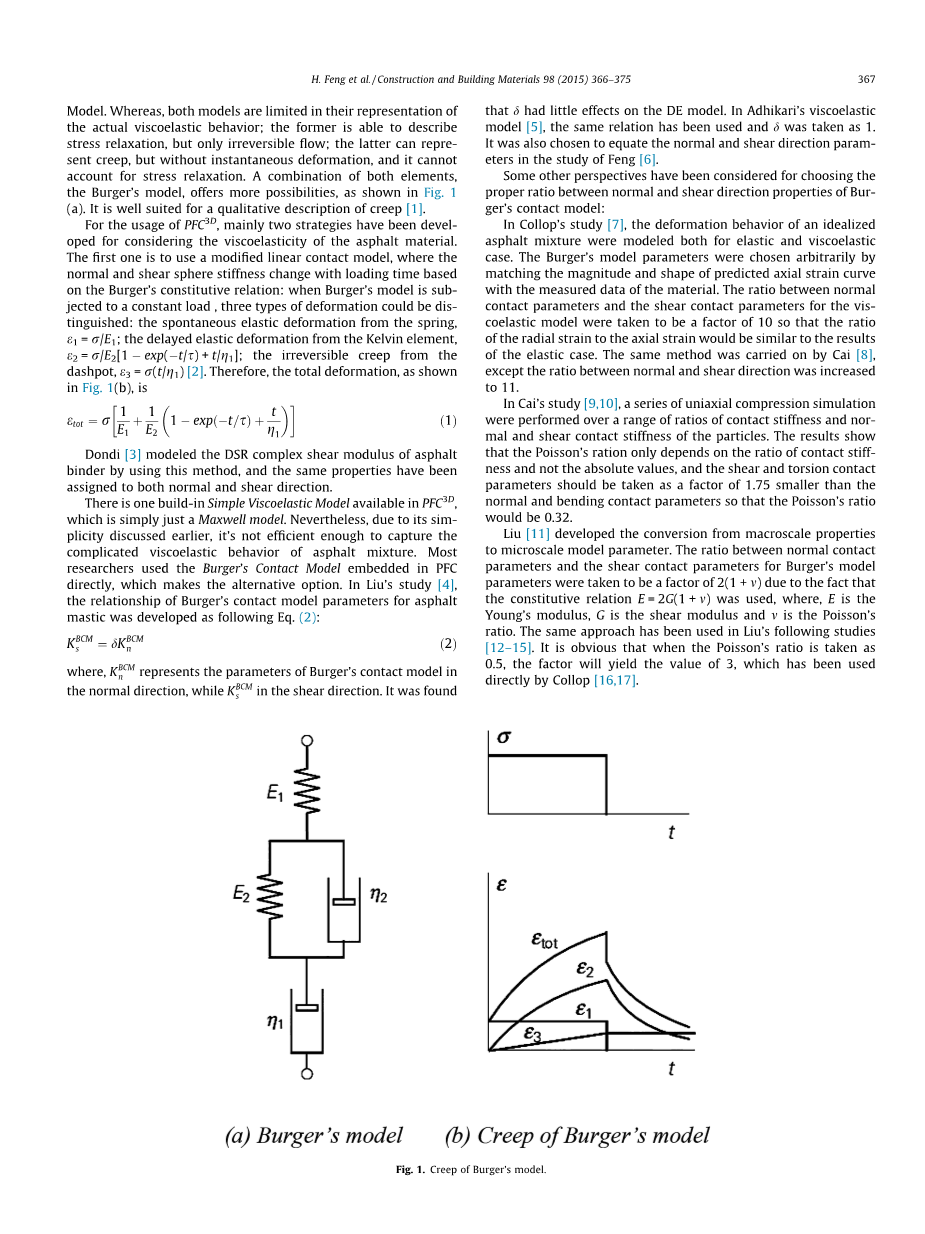 在Collop的研究中,一个理想化的沥青混合物的变形行为的弹性模量和粘弹性模型盒。伯格斯的模型参数由任意选择匹配预测的轴向应变曲线的大小和形状与材料的测量数据。正常之间的比率接触参数和粘弹性的剪切接触参数模型取为10的因子,使得比率的轴向应变的径向应变将类似于结果的弹性盒。除了正常和剪切方向之间的比率增加至11,Cai [8]采用相同的方法。