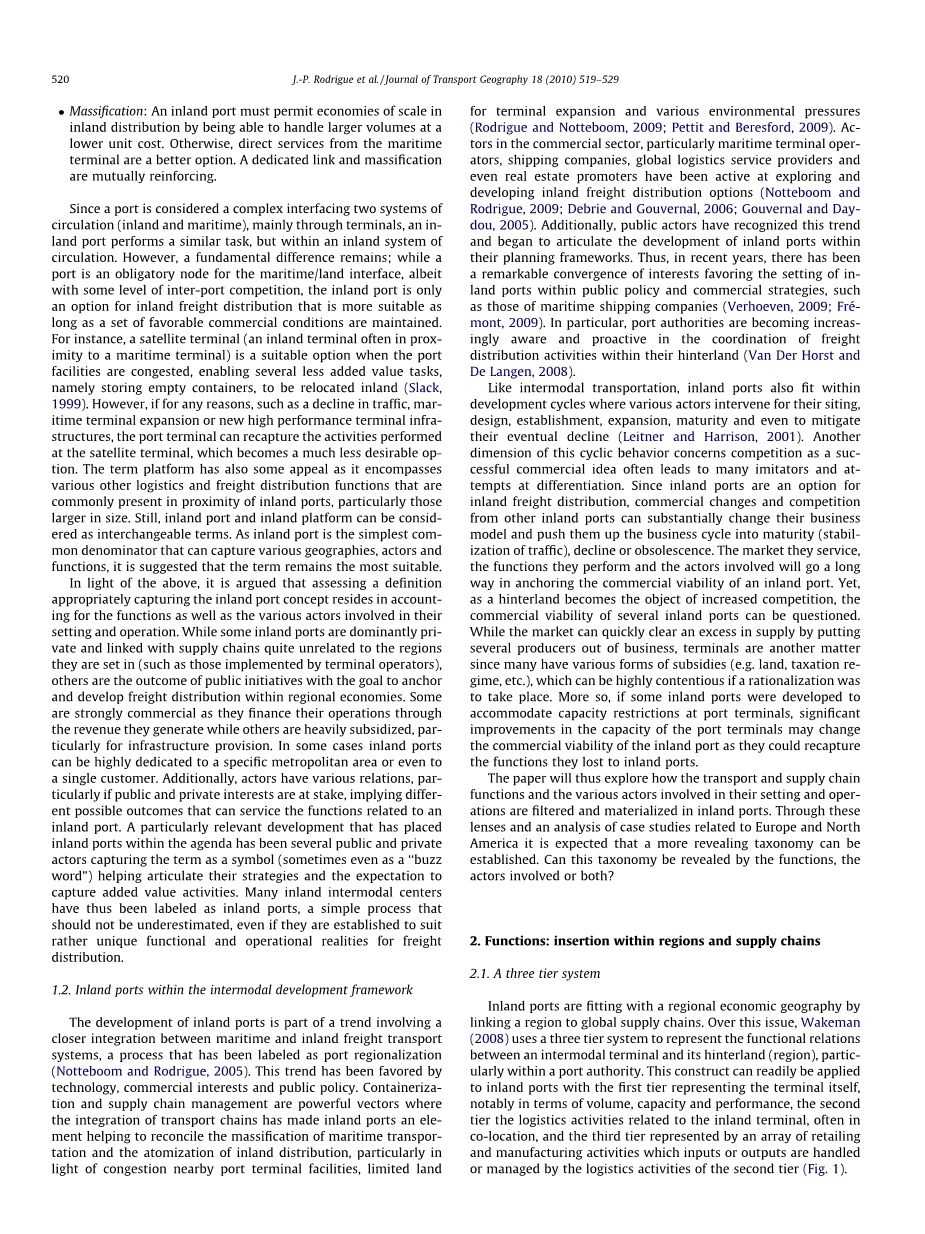 2.功能:插入区域和供应链2.1。三层体系通过将一个地区与全球供应链联系起来,内陆港口适合区域经济地理。在这个问题上,Wakeman(2008)使用三层系统来代表多式联运终端与其腹地(区域)之间的功能关系,特别是在港口当局内。这种结构可以很容易地应用到内陆港口,第一层代表终端本身,特别是在数量,容量和性能方面,第二层与内陆终端相关的物流活动,通常在共同位置,第三层由一系列的零售和制造活动组成,其中输入或输出由第二层的物流活动处理或管理(图1)