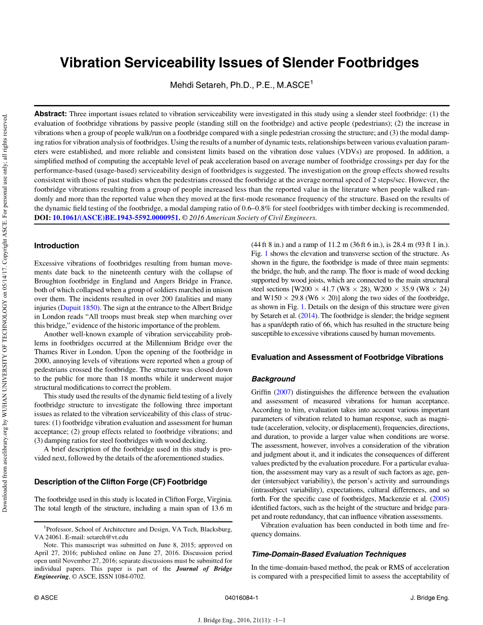 本研究采用活跃的人行桥结构的动态现场测试结果,对以下三类重要问题进行了研究:(1)人体桥梁振动评估与评估验收; (2)与人行桥振动有关的群体效应; 和(3)具有木板的钢脚踏板的阻尼比。