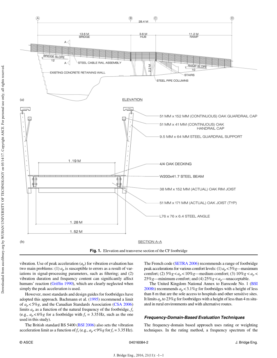这项研究中使用的行人天桥位于弗吉尼亚州的克利夫顿福吉(Clifton Forge),其总长度为13.6米(44英尺8英寸),斜坡为11.2米(36英尺6英寸)。 图1示出了结构的高程和横截面。如图所示,行人天桥由三个主要部分组成:桥梁,枢纽和斜坡。地板是由木质托梁支撑的木地板制成,与木质托梁相连,主要结构钢段[W200 41.7(W8〜28),W200 35.9(W8〜24),W150〜 29.8(W6〜20)],如图1所示。该结构的设计细节由Setareh等人提供(2014)。 行人天桥是苗条的。 桥段的跨度/深度比为66,这导致结构容易受到人体运动引起的过度振动。
