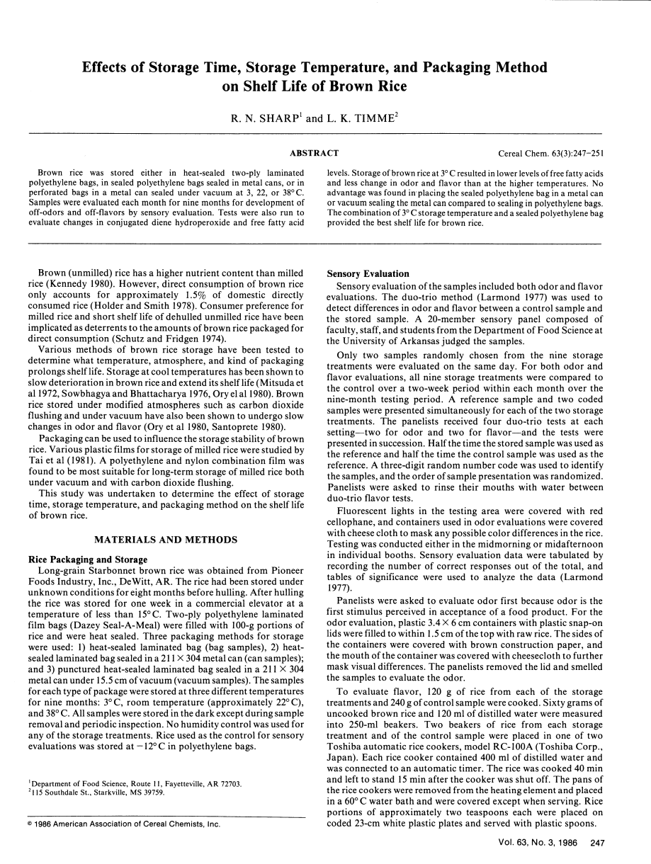 糙米包装和储存:龙纹米饭是从先锋食品工业公司获得的,DeWitt,AR。前八个月储存的已被去壳的米饭属于未知状况。去皮后大米在商业电梯中储存一周,环境温度低于150℃。在双层聚乙烯层压电影袋(Dazey Seal-A一餐)中充满100克部分大米并热密封。分别用三种包装方式存放使用:1)热封层压袋(袋样品),2)密封层压袋密封在211 X 304金属罐(可以样品);和3)密封在15.5厘米以下的真空211times;304的穿刺的热封层压袋(真空样品)。每种类型的样品包装在三种不同的温度下储存九个月:30℃,室温(约22C),和380℃。除样品外,所有样品都保存在黑暗中,清除和定期检查。不使用任何湿度控制存储处理。作为感官控制评估的糙米放在在一个12C储存在聚乙烯袋中。