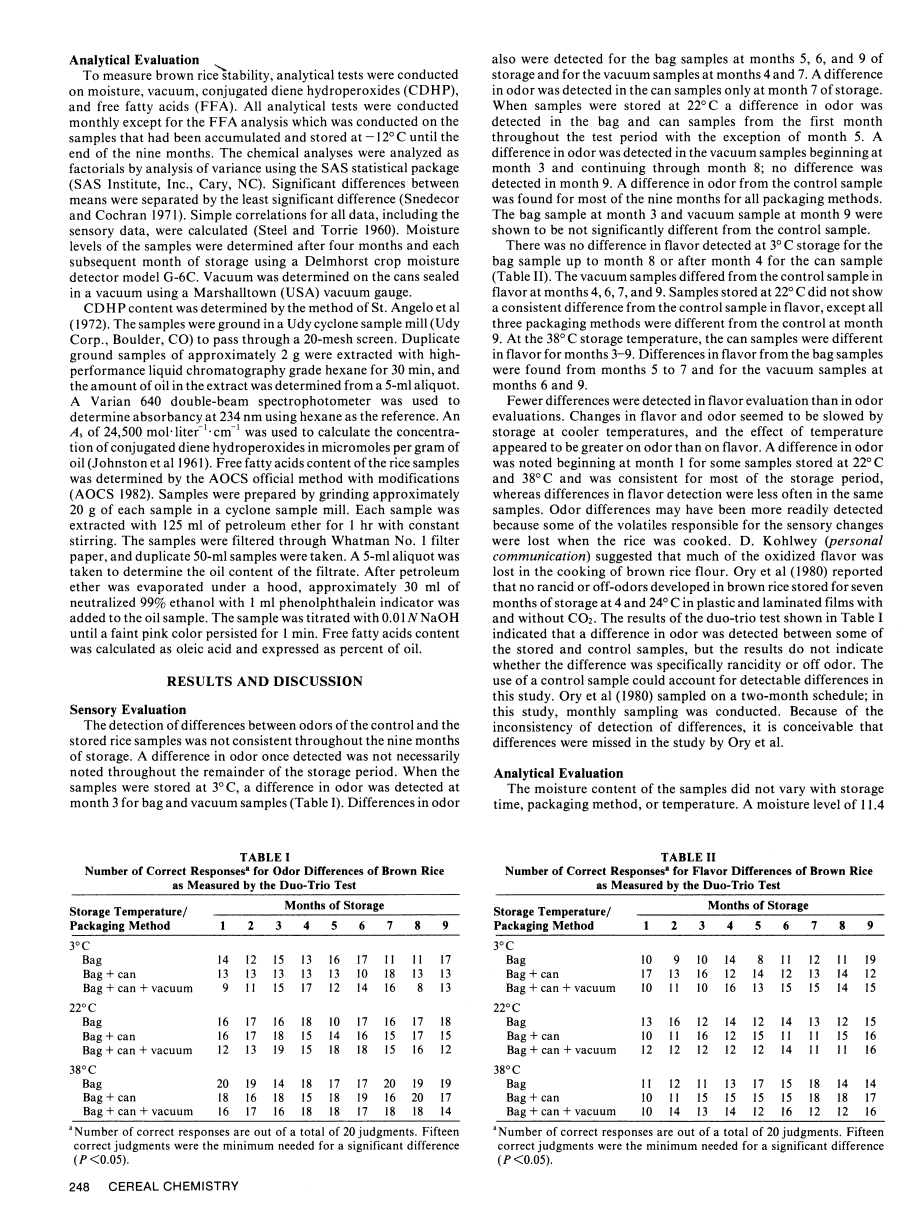 对褐色糙米中共轭二烯氢过氧化物(CDHP)和FFA的化学测试进行的方差分析结果表明,所有主要影响和相互作用在0.05水平上显着。长期储存导致CDHP和FFA值的影响.Ole el al(1980)报道,储存的糙米的CDHP水平在5个月时达到峰值,然后在7个月时下降,而FFA水平在整个储存期内稳定增加.CDHP水平显示本研究的波动(表III),峰值出现在第2和第7。FFA值也在第3和第9个月出现波动峰.CDHP没有增加,因为储存温度从3℃升高到22℃,但随温度从22℃升高到38℃,而FFA水平随着温度的升高而升高。作为主要效果,包装方法显示了袋和真空样品之间的CDHP水平的差异,其中罐头样品与两者之间没有差异。袋样品的FFA水平低于罐头或真空样品的水平,这没有差别。