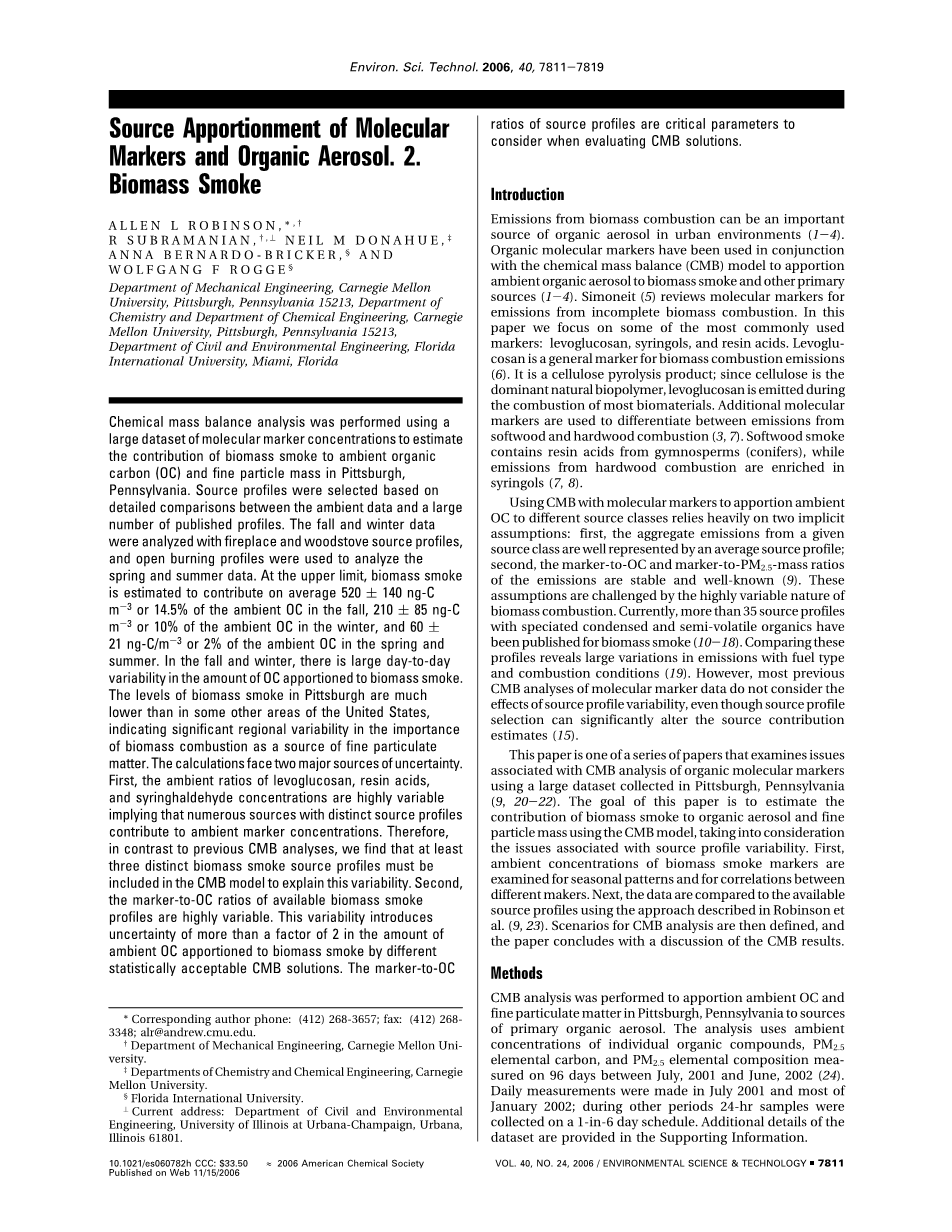 本文是研究问题的一系列论文之一,使用在宾夕法尼亚州匹兹堡收集的大型数据集(9,20-22)与有机分子标记的CMB分析。本文的目的是估计生物质烟雾对有机气溶胶的贡献,使用CMBmodel进行粒子质量考虑与源文件变异相关的问题。首先,生物质能烟雾标记的环境浓度,检查了季节性模式和相关性不同的制造商。接下来,将数据与可用数据进行比较,源概要文件使用Robinson等人描述的方法(9,23),然后定义CMB分析的方案,本文最后讨论了CMB的成果。